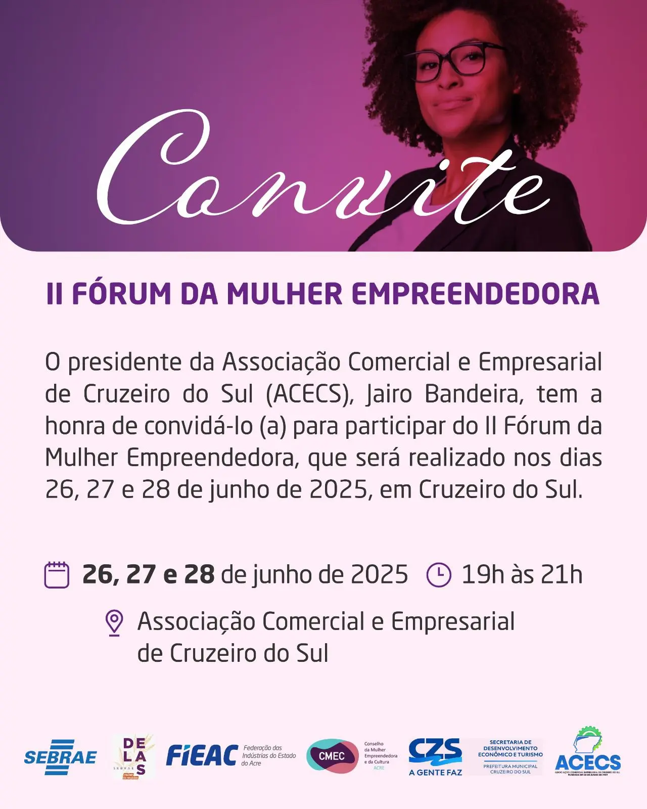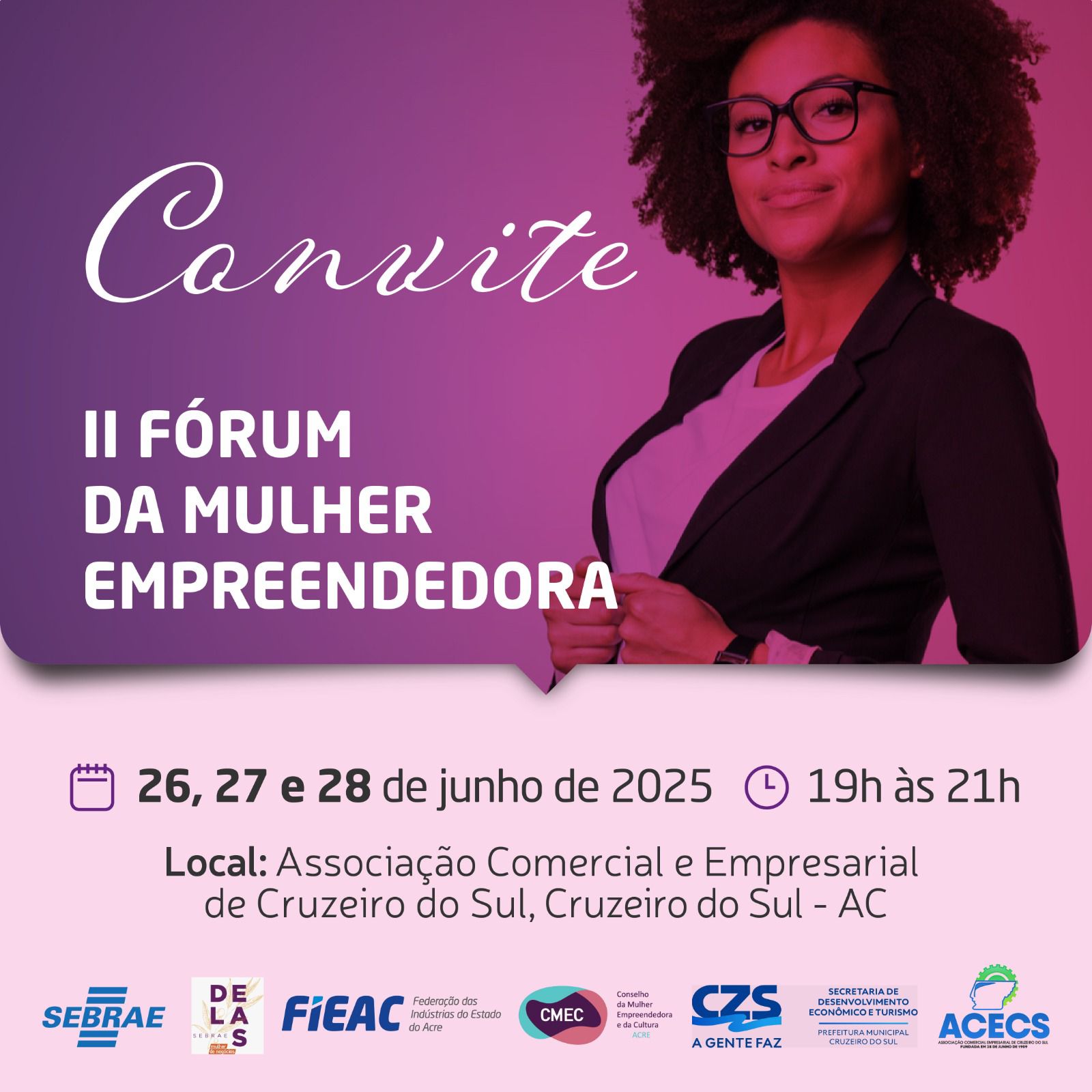 A cidade de Cruzeiro do Sul será palco, nos dias 26, 27 e 28 de junho de 2025, do II Fórum da Mulher Empreendedora, evento promovido pela Associação Comercial e Empresarial de Cruzeiro do Sul (ACECS). A programação acontecerá das 19h às 21h, na sede da instituição organizadora.