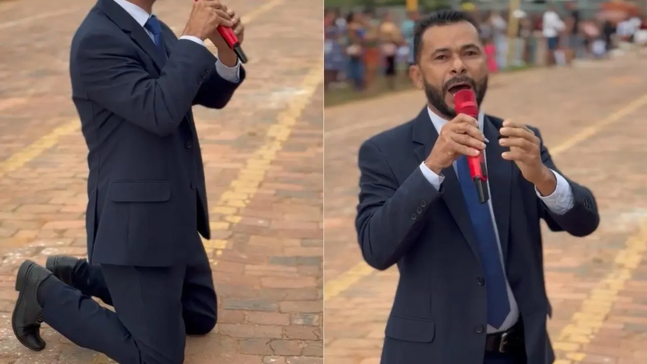 Em um gesto que surpreendeu e comoveu a população presente, Rosildo se ajoelhou diante das autoridades e da plateia e, com voz embargada, fez o apelo/Foto: Reprodução