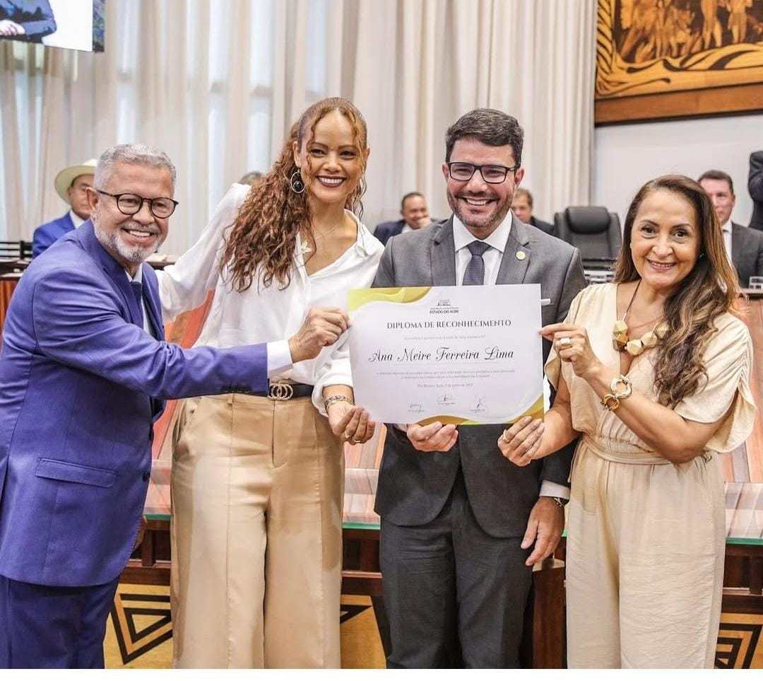 Meire Manaus, na foto com o governador Gladson Cameli, entre outros nomes da sociedade acreana, foi agraciada com o Diploma de Reconhecimento da Assembleia Legislativa do Estado do Acre, pelos relevantes serviços na contribuição ao fortalecimento e consolidação da Expoacre. Nossos parabéns e admiração ao trabalho dessa pioneira no ramo da moda e beleza.