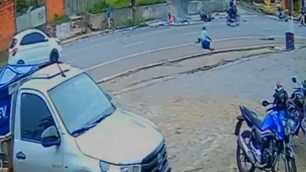 Nas imagens é possível ver o exato momento em que duas das motocicletas ficaram presas por grades que transportavam botijas de gás e atingiram outra moto que trafegava sentido contrário.