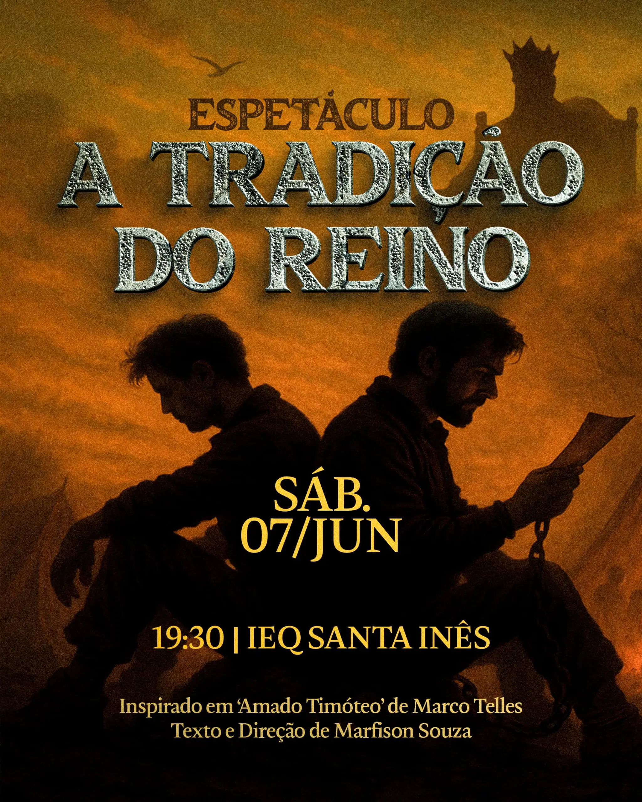 No próximo sábado (7) a Igreja do Evangelho Quadrangular (IEQ) Santa Inês, localizada na Rua Edmundo Pinto, 663, bairro Santa Inês, será palco da apresentação do espetáculo teatral “A Tradição do Reino”. A obra, de autoria própria e totalmente gratuita, terá apresentação a partir das 19h30.