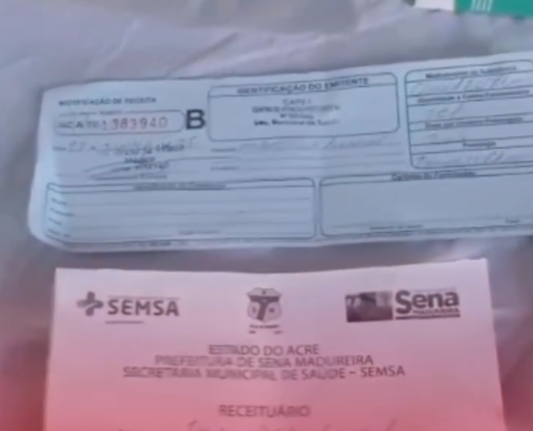 Receita médica de tratamento para pressão arterial, um dos medicamentos em falta na Farmácia Popular de Sena Madureira, segundo moradores/Foto: Reprodução/Sena News