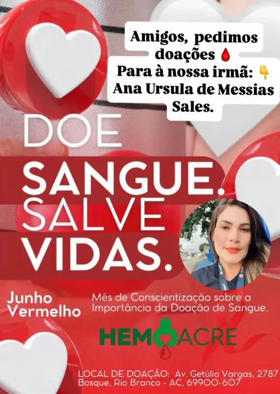 Em meio à campanha Junho Vermelho, que destaca a importância da doação de sangue, familiares e amigos de Ana Ursula de Messias Sales, de 31 anos, fazem um apelo urgente por doadores em Rio Branco.