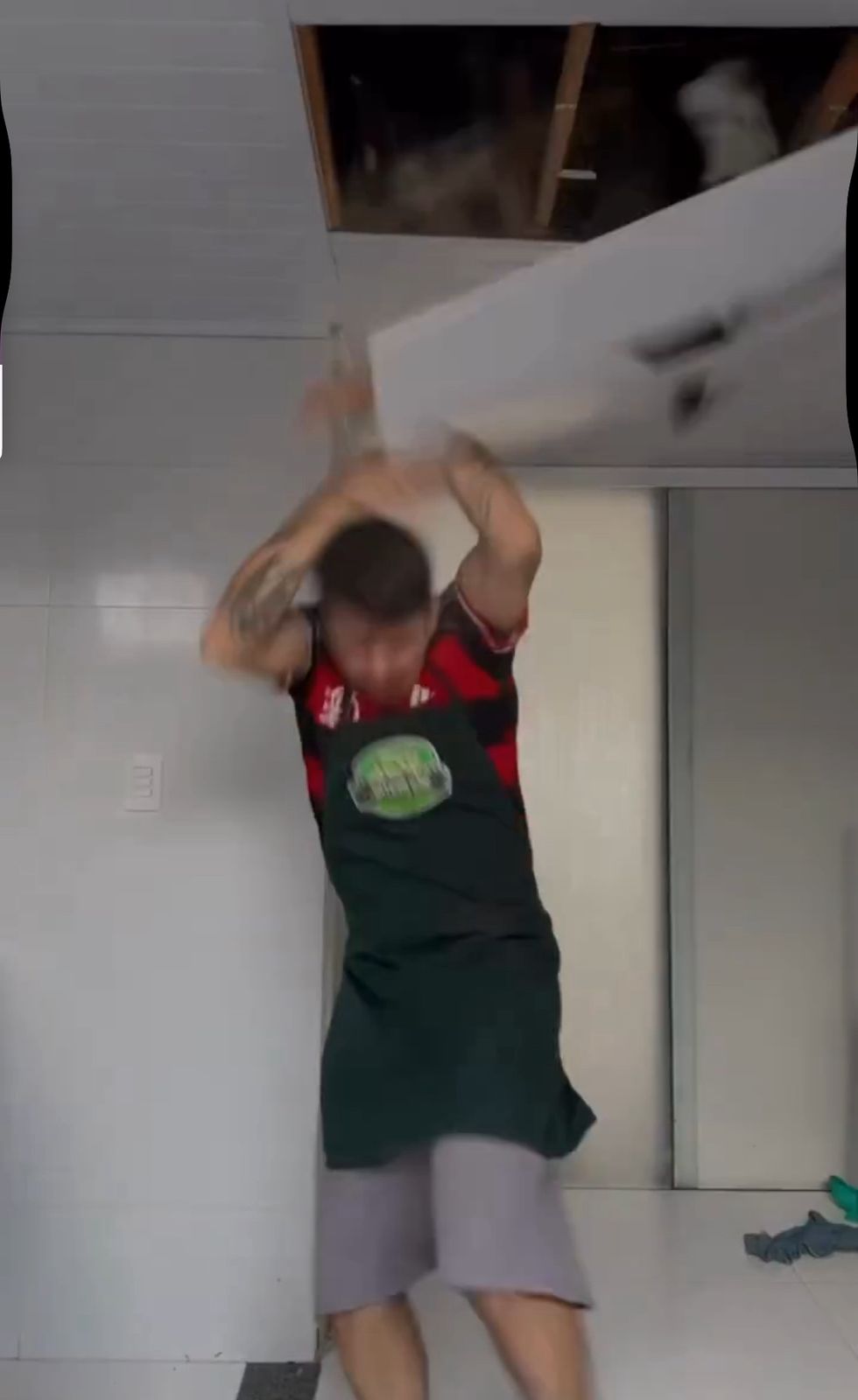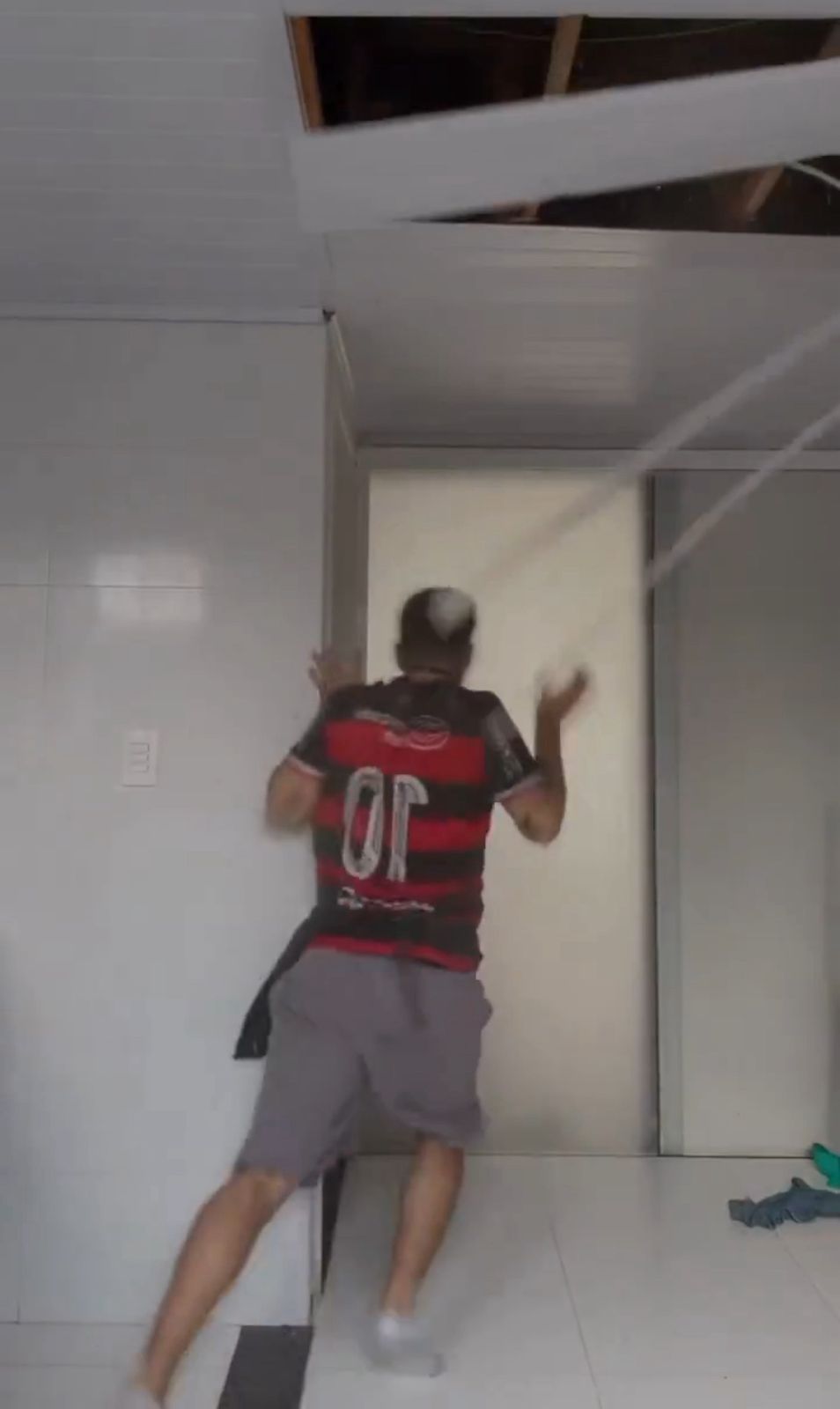 Nas imagens, o jovem — vestido com uma camisa do Flamengo e um avental de cozinha — aparece sorridente dançando na sala de casa, enquanto grava a coreografia. De repente, um estrondo vindo do teto interrompe a performance: um gato despenca entre as telhas, que se quebram com o impacto, assustando o rapaz, que sai correndo.