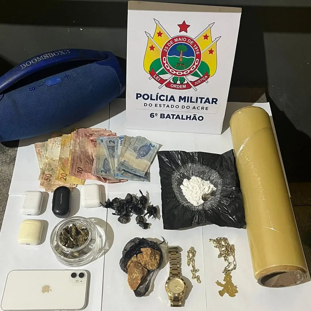 Durante a averiguação, a equipe encontrou diversas porções de drogas e materiais suspeitos. Ao todo, foram apreendidos: