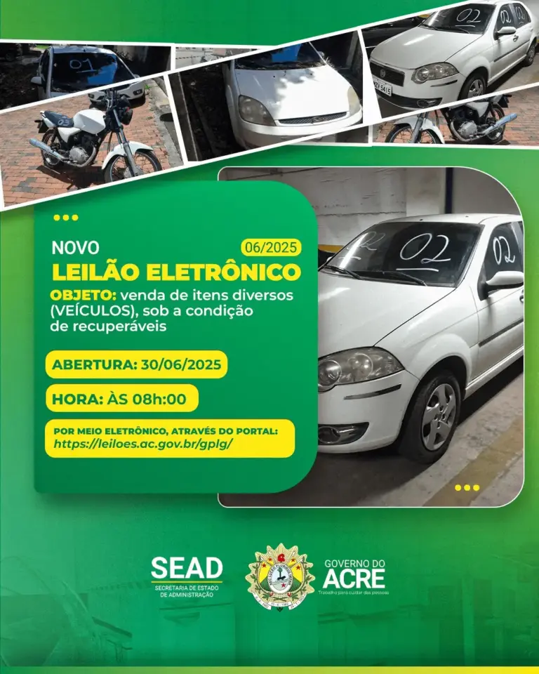 O governo do Acre vai promover um leilão eletrônico de veículos no próximo dia (30) de junho, das 8h às 13h (horário local), com a oferta de três lotes compostos por dois carros e uma motocicleta pertencentes ao patrimônio público estadual. A ação será conduzida pela Secretaria de Estado de Administração (Sead) e acontecerá exclusivamente pela internet, por meio do portal oficial do Sistema Eletrônico de Leilões (SEL/Acre).