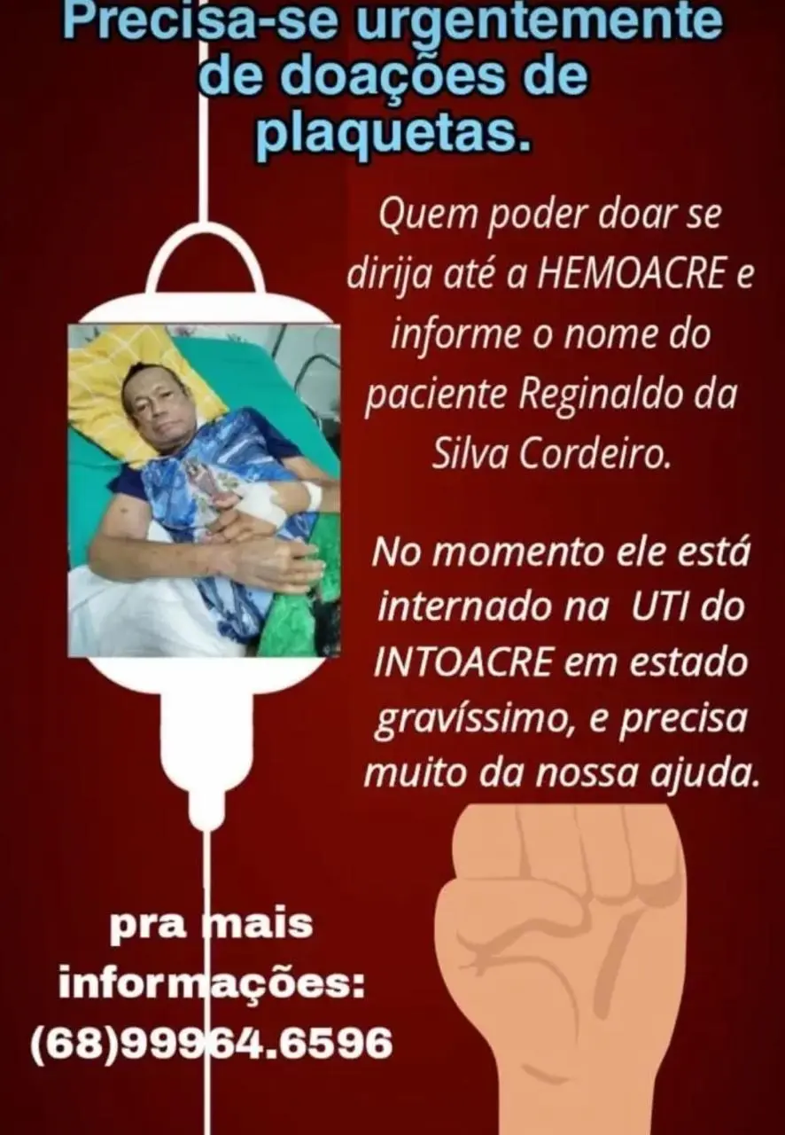 Diante da situação, familiares e amigos fazem um apelo à população para que se dirijam ao Hemoacre e realizem a doação em nome de Reginaldo da Silva Cordeiro. O gesto solidário pode ser fundamental para o tratamento e recuperação do comunicador.