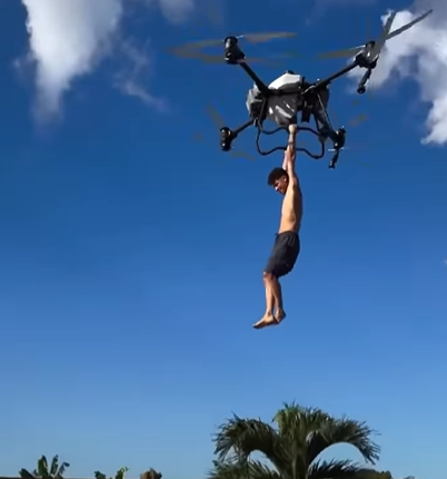 Um vídeo que mostra um jovem sobrevoando uma piscina com a ajuda de um drone agrícola tem repercutido nas redes sociais nos últimos dias. A cena inusitada impressiona pelo porte do equipamento, que consegue sustentar o peso do rapaz enquanto ele sobrevoa o local antes de cair na água.
