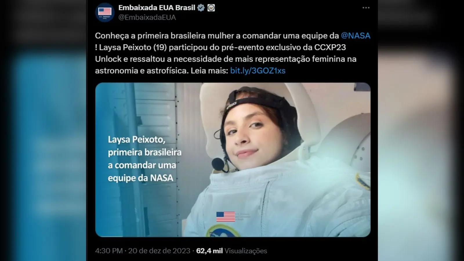 Usuários do X resgataram um post feito em 2023 pelo perfil oficial da embaixada na rede social. Na publicação, a instituição chegou a elogiar a jovem, afirmando que ela seria “a primeira brasileira mulher a comandar uma equipe da NASA”.