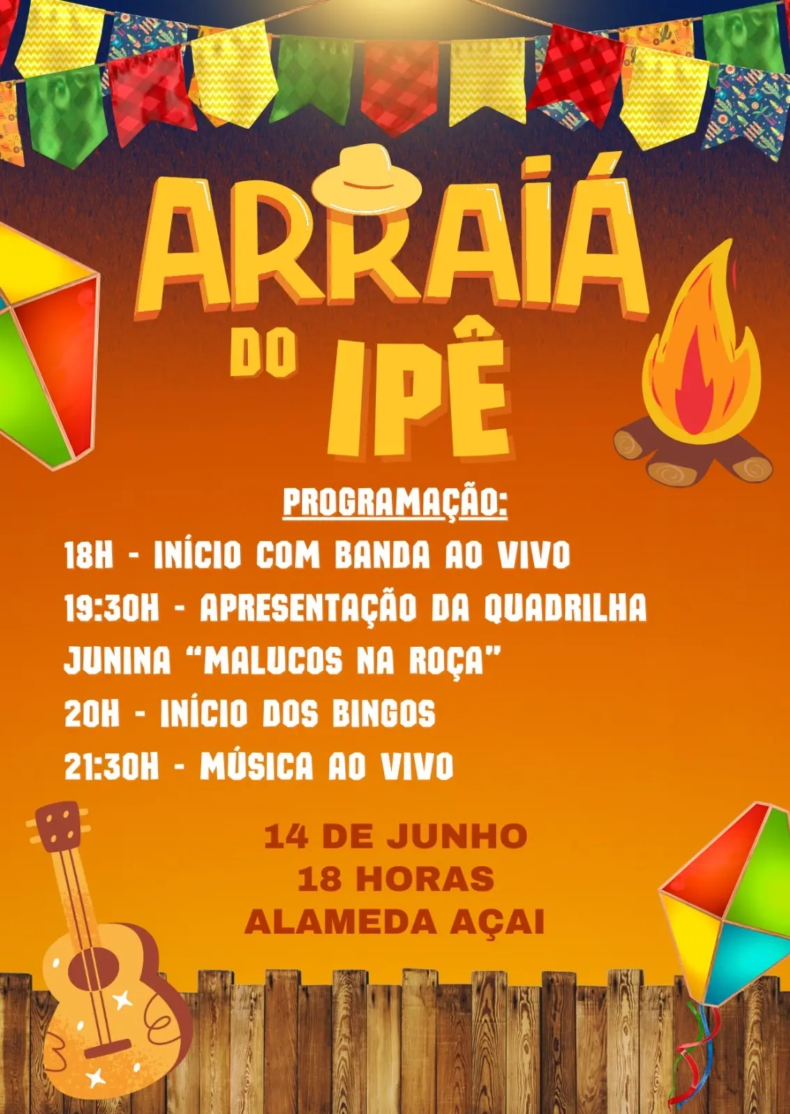 O sábado promete ser daqueles com o tradicional Arraiá do Ipê, com tudo o que tem direito: quadrilha, comidas típicas, sanfona afinada e muita animação sob as estrelas. Show de bola!