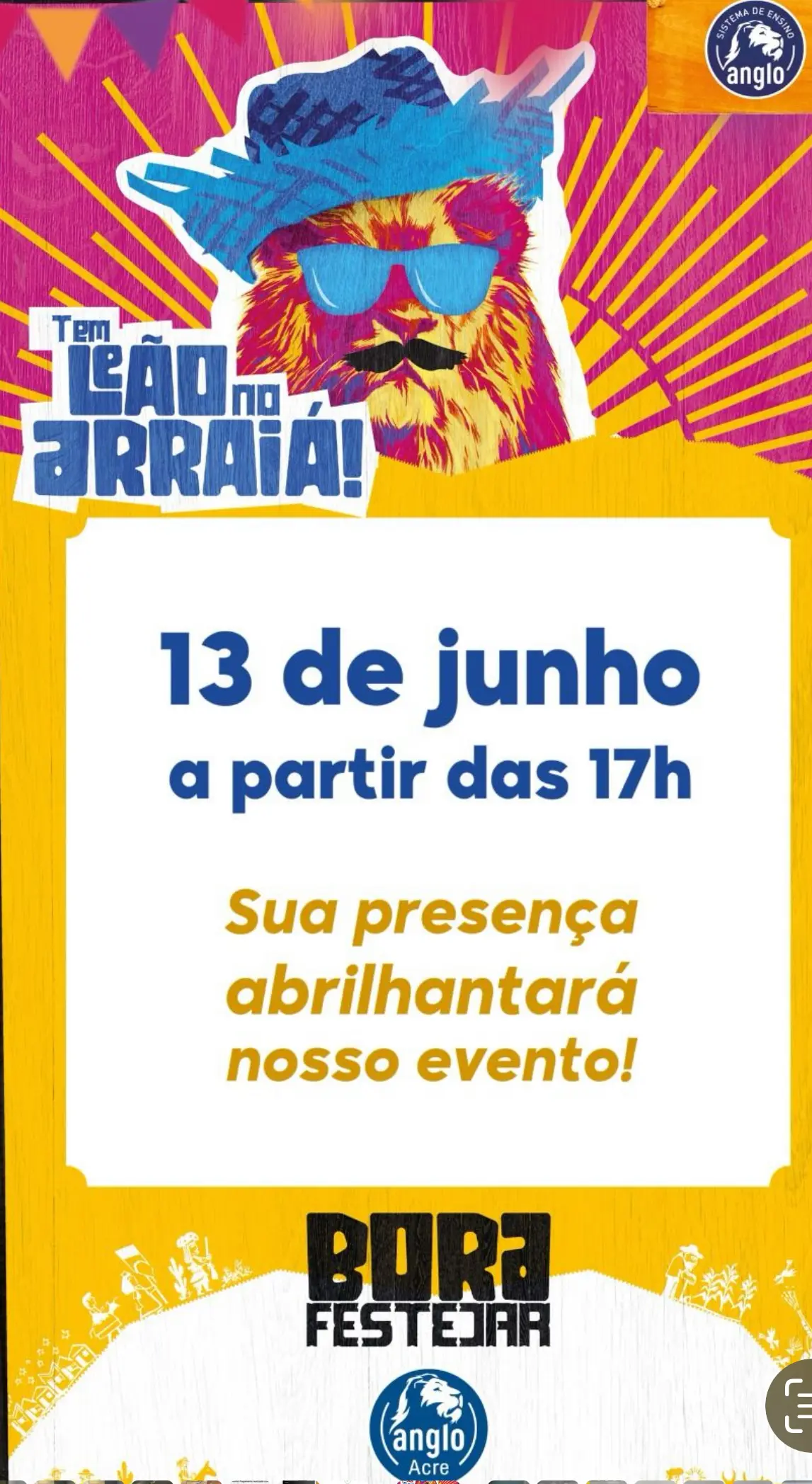 Sextou com S de sanfona, suor e sucesso! Nesta sexta, 13, o tradicional Arraiá do Colégio Anglo promete agitar a cidade com seu mix de cultura, alegria e encanto. A festança, que já virou referência no calendário junino, atrai centenas de pessoas todos os anos e reúne alunos, famílias e amigos em uma celebração arretada de boa! Prepare o chapéu de palha, a bota e o coração: vai ser show de bola!