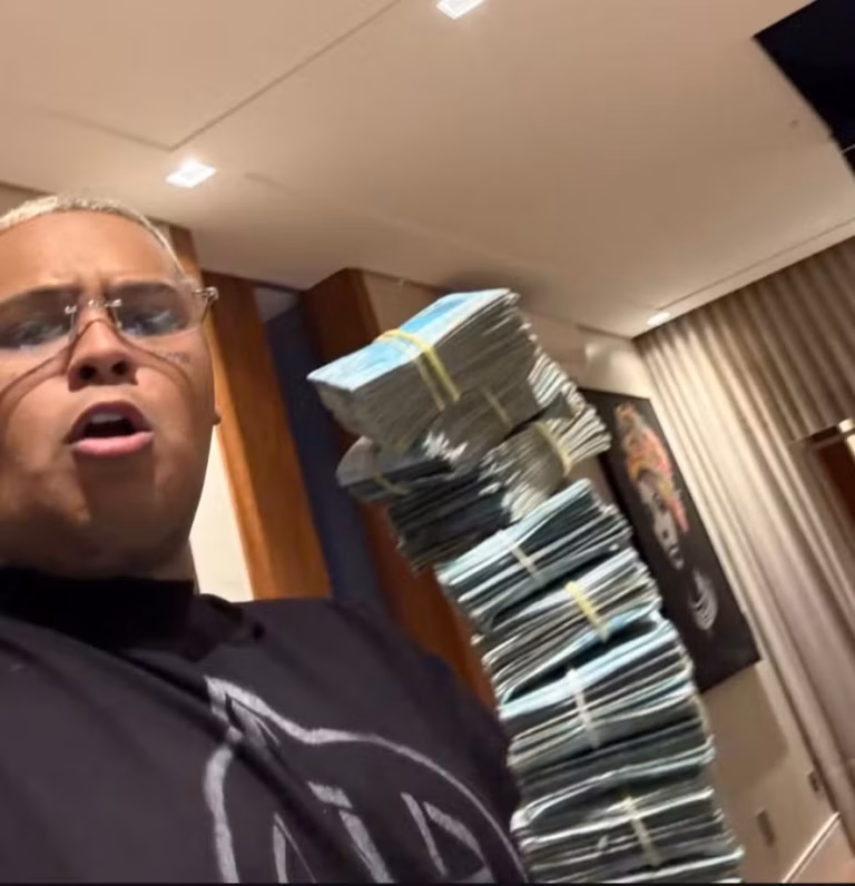 MC Ryan SP voltou a chamar atenção nas redes sociais ao surgir exibindo um bolo de notas de R$ 100 enquanto divulgava um site de apostas, os chamados “joguinhos de bet”. No vídeo, o funkeiro aparece com uma grande quantia em espécie. “Alguém quer um bolo aí?”, perguntou ele.