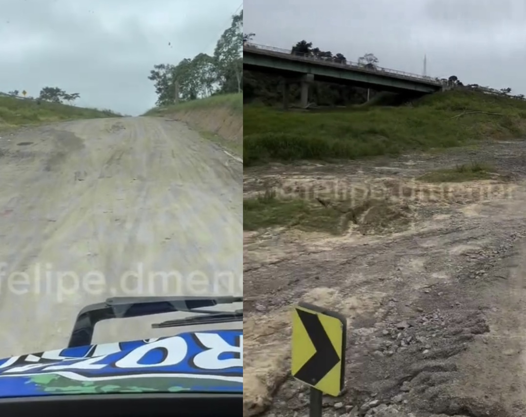 “Olha o tanto já que cedeu no aterramento que fizeram. Fica o alerta aí para as autoridades, está cedendo o aterramento. Uma carreta acabou de passar com dificuldade para subir. Positivo? Fica o alerta aí para o DNIT tomar as providências”, afirma o caminhoneiro.