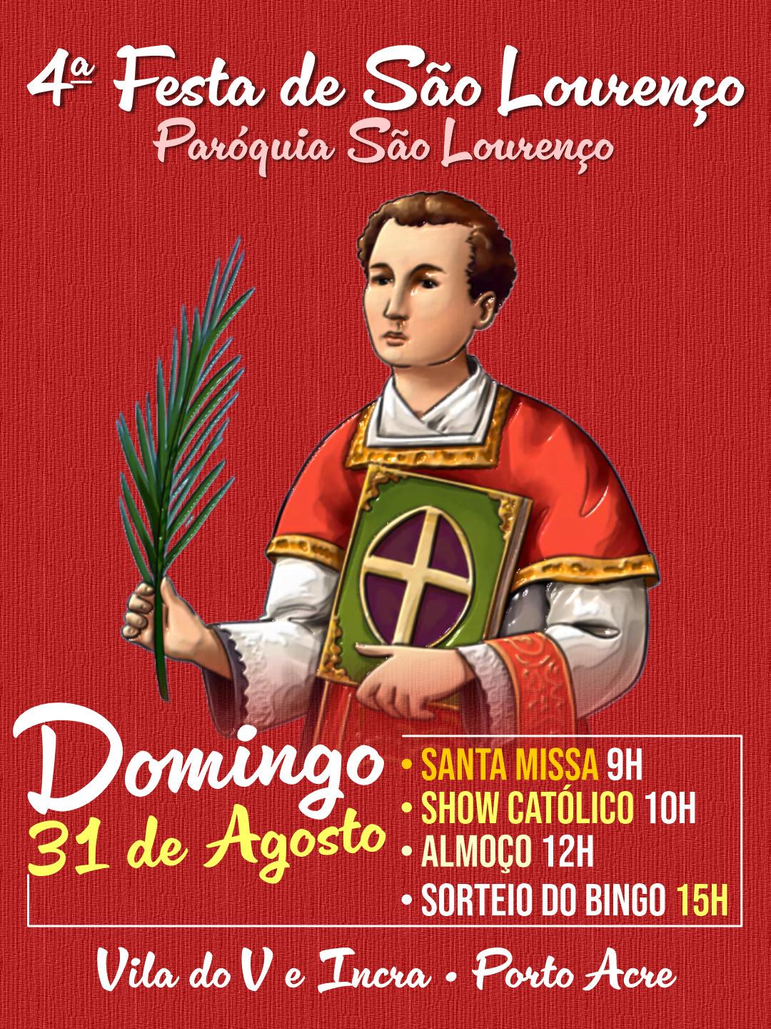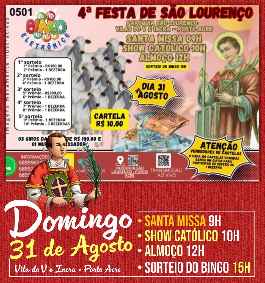 A comunidade católica da Vila do V e do Incra, em Porto Acre, se prepara para celebrar no dia 31 de agosto a 4ª edição da Festa de São Lourenço, promovida pela Paróquia São Lourenço. O evento já é tradição na região e promete reunir fiéis e famílias em um dia de oração, música, partilha e solidariedade.