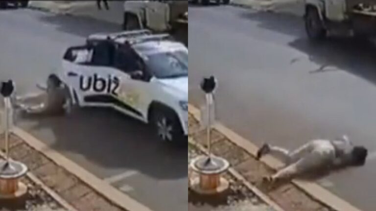 O vídeo mostra o momento em que a passageira abre a porta do veículo ainda em movimento, rola no asfalto e logo se levanta, caminhando tranquilamente pela calçada. A cena chamou atenção pela frieza da ação e rapidamente viralizou nas redes sociais.