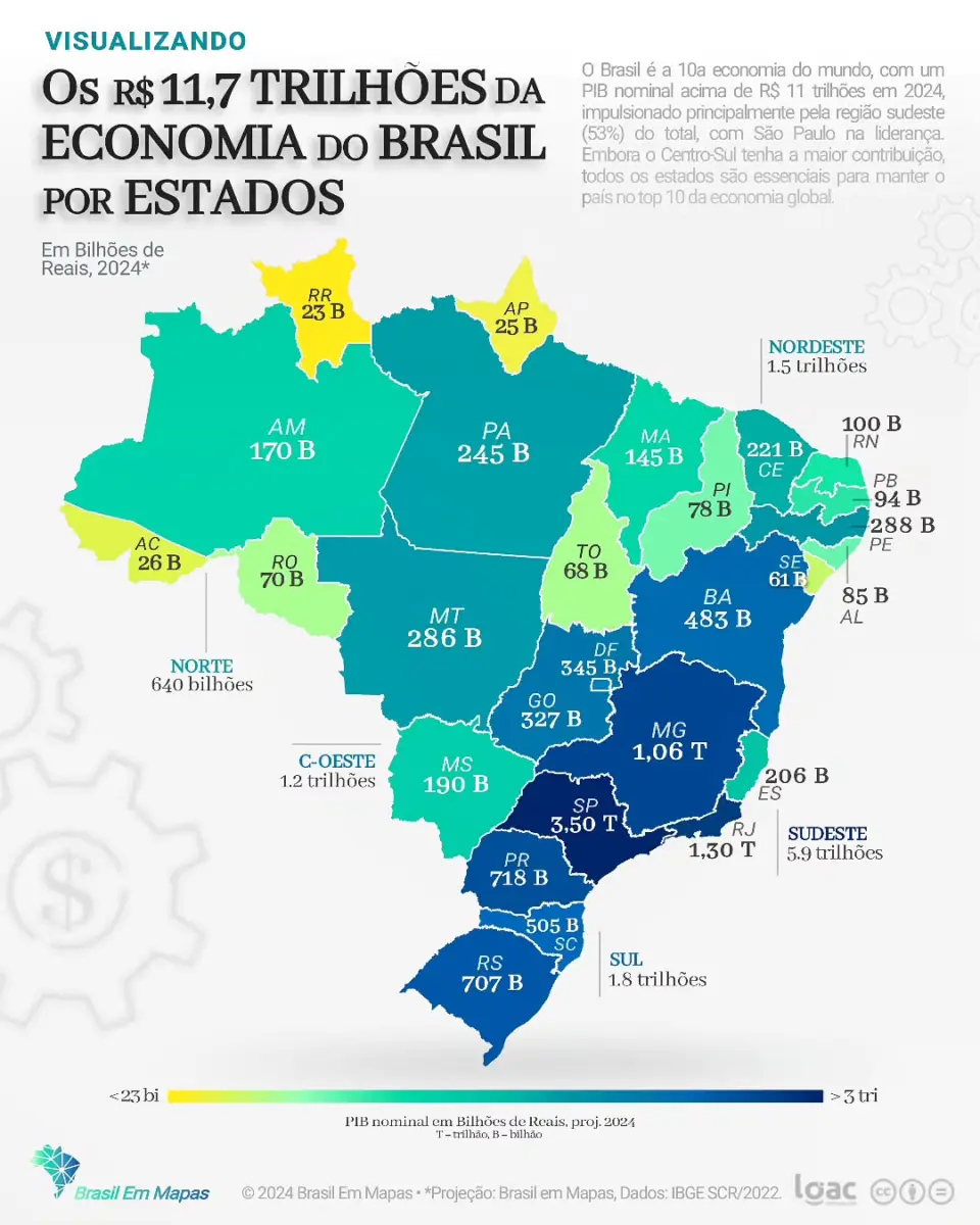 O dado consta em levantamento do Brasil em Mapas, que utilizou informações do Sistema de Contas Regionais de 2022 do Instituto Brasileiro de Geografia e Estatística (IBGE), ajustadas pelas taxas médias de crescimento nacional e estadual nos anos de 2022 e 2023, e com base no desempenho do terceiro trimestre de 2024.