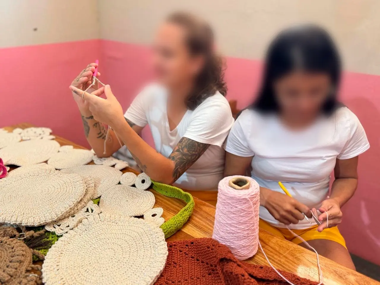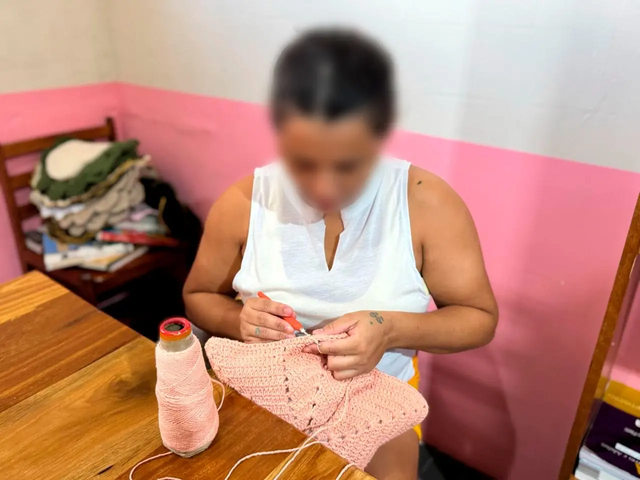 A reeducanda Jamile Santiago aprendeu o crochê dentro do presídio e enfatiza que a prática hoje é importante na sua ressocialização e por estar aprendendo uma profissão que lhe garante paz mental e fonte de renda.