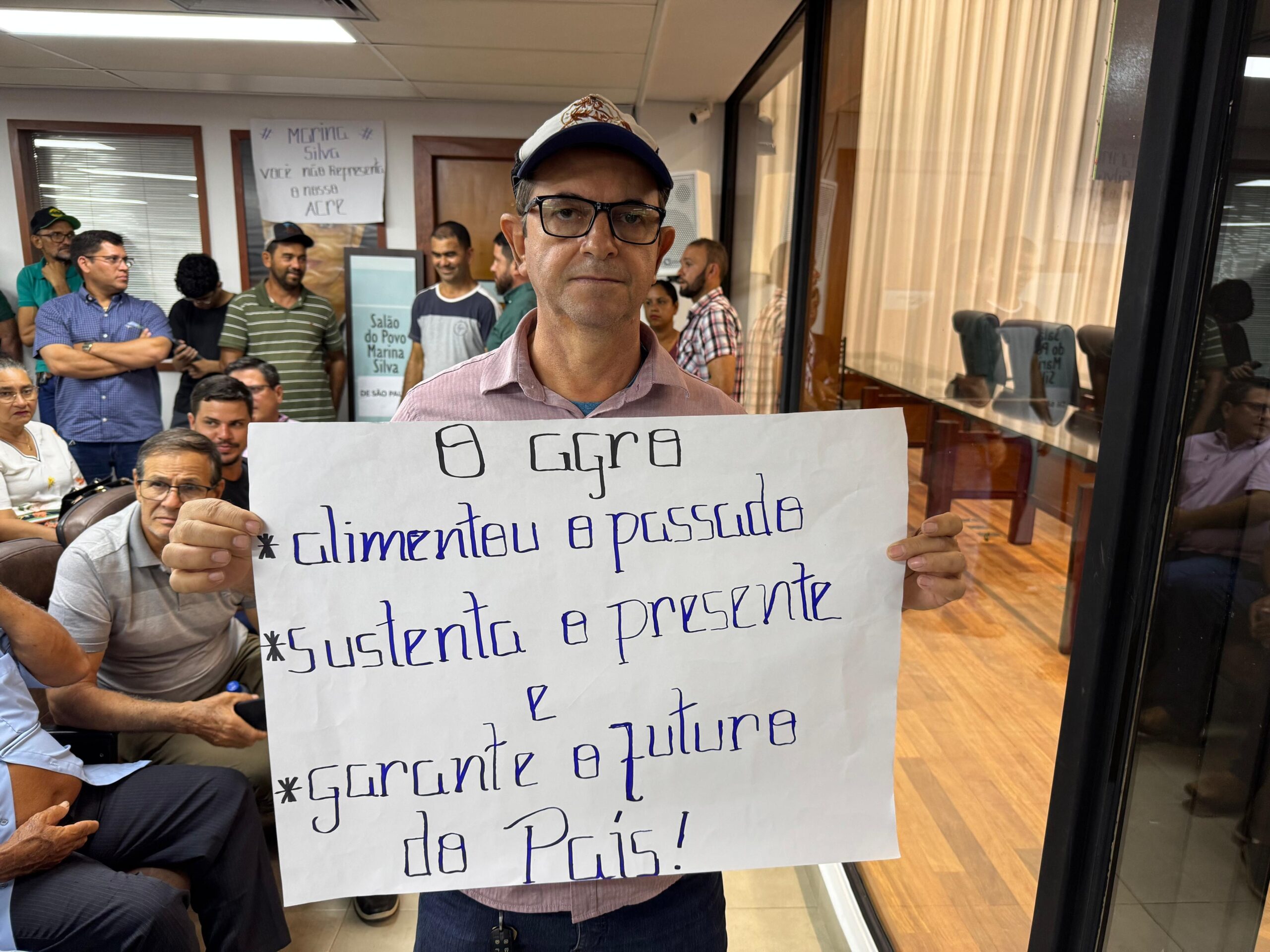 Os manifestantes usam cartazes defendendo o agronegócio e repudiando a acreana e ministra do Meio Ambiente e Mudanças Climáticas, Marina Silva. “Produtor não é bandido”, diz um deles. “Marina Silva, você não representa o Acre”, destaca outro.