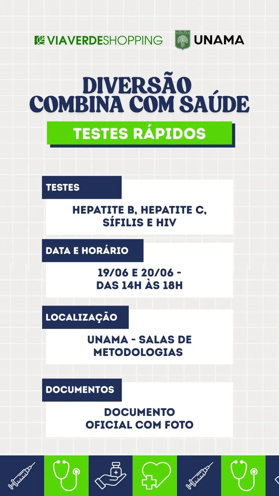 Nos dias 19 e 20 de junho, das 14h às 18h, a UNAMA, em parceria com o Via Verde Shopping, realiza uma ação especial de saúde com a oferta gratuita de testes rápidos voltados ao público adulto. Serão disponibilizados exames para detecção de Hepatite B, Hepatite C, Sífilis e HIV, em um ambiente seguro e com orientação profissional.