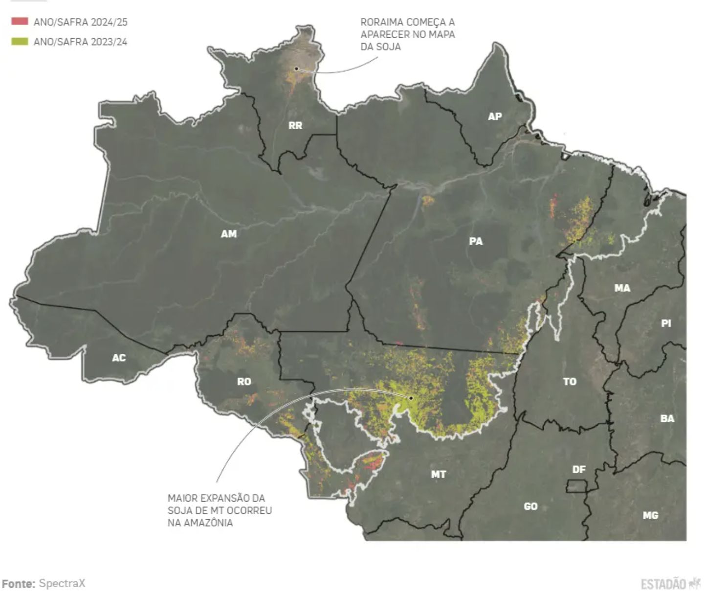 Esse crescimento é puxado principalmente por estados como Mato Grosso, Pará e Rondônia, onde o agronegócio tem ampliado fronteiras e investido na conversão de terras para o cultivo de grãos. Por outro lado, Acre, Amazonas e Amapá não apresentaram nenhum acréscimo nas áreas de produção de soja, mantendo os mesmos patamares das safras anteriores.