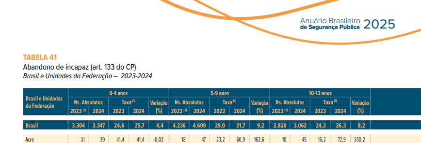 O Acre registrou um aumento expressivo nos casos de abandono de incapaz entre crianças e adolescentes em 2024. Segundo o Anuário Brasileiro de Segurança Pública, publicado na última quinta-feira (24), foram 150 ocorrências registradas no estado no ano passado, contra 72 casos em 2023, um crescimento de 112,4%.