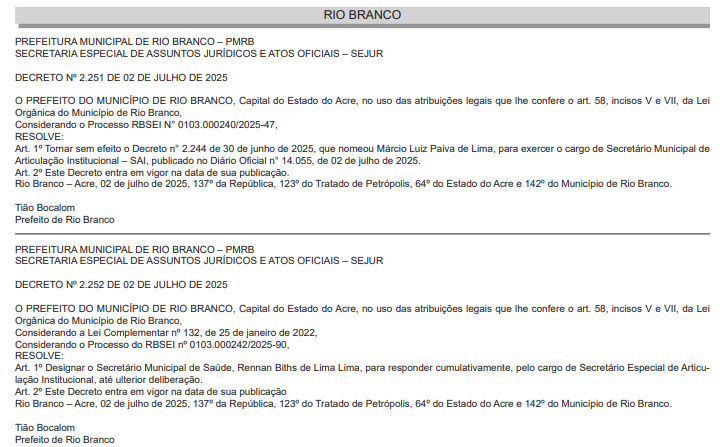 O prefeito Tião Bocalom tornou sem efeito a nomeação do secretário-adjunto de Governo (Segov), Marcio Pereira, que havia sido colocado no cargo de secretário de Articulação Institucional, na última segunda-feira (30).
