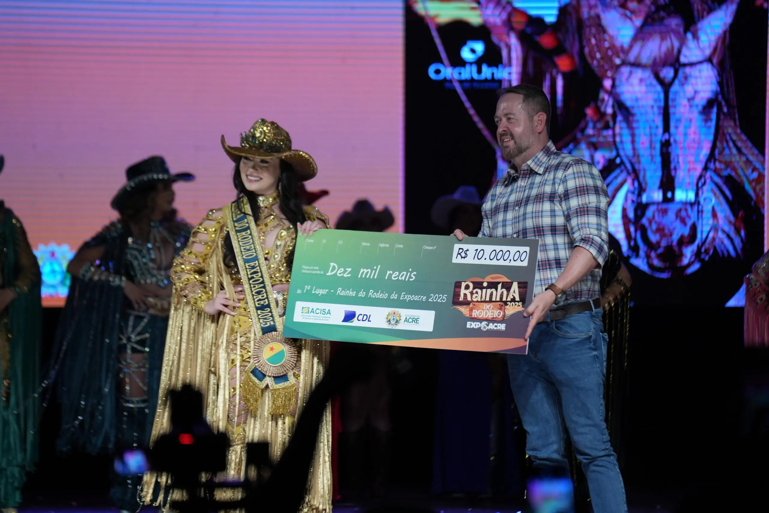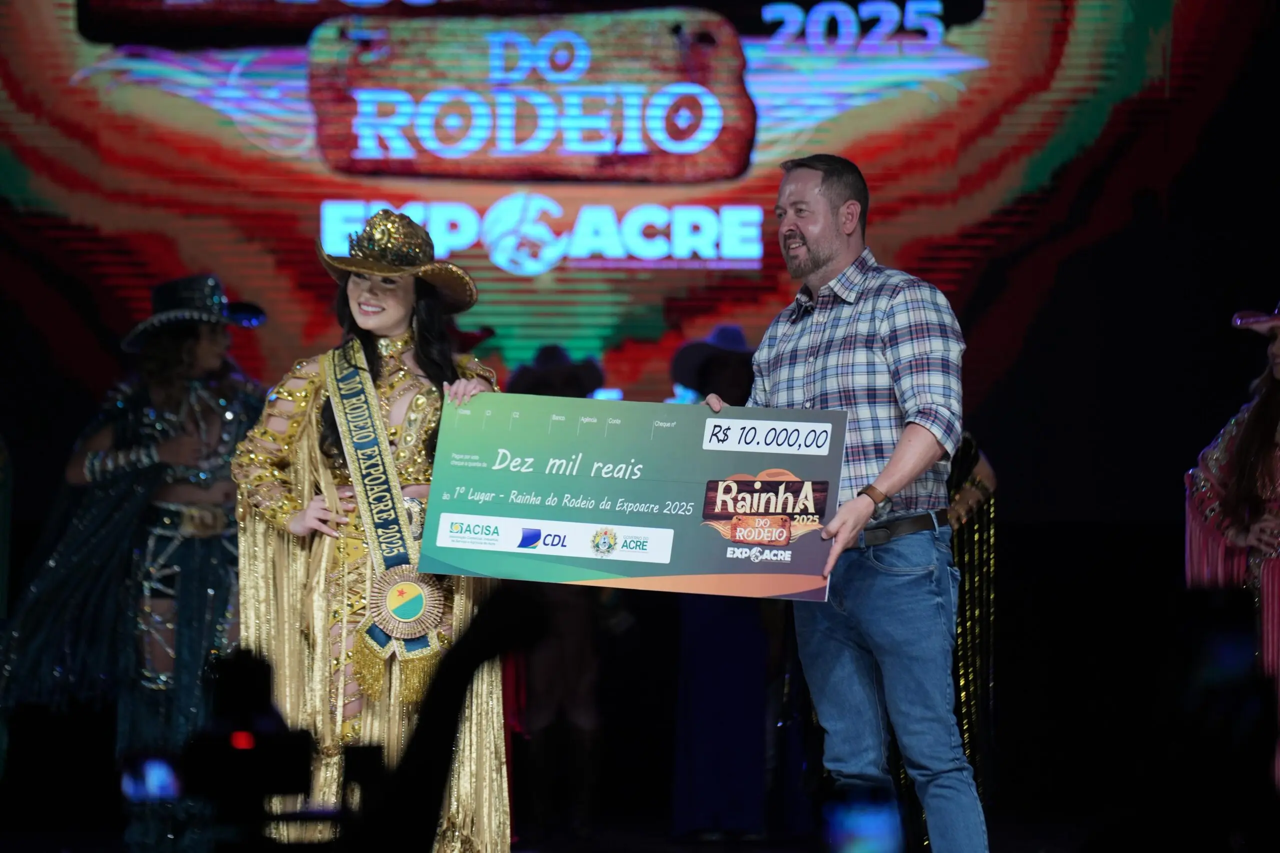 Camila Assunção é eleita Rainha do Rodeio da Expoacre 2025/Foto: ContilNetAlém da faixa e da coroa de Rainha do Rodeio da ExpoAcre 2025, Camila recebeu um cheque no valor de R$ 10 mil, entregue pelo secretário de Turismo e Empreendedorismo do Acre, Marcelo Messias.
