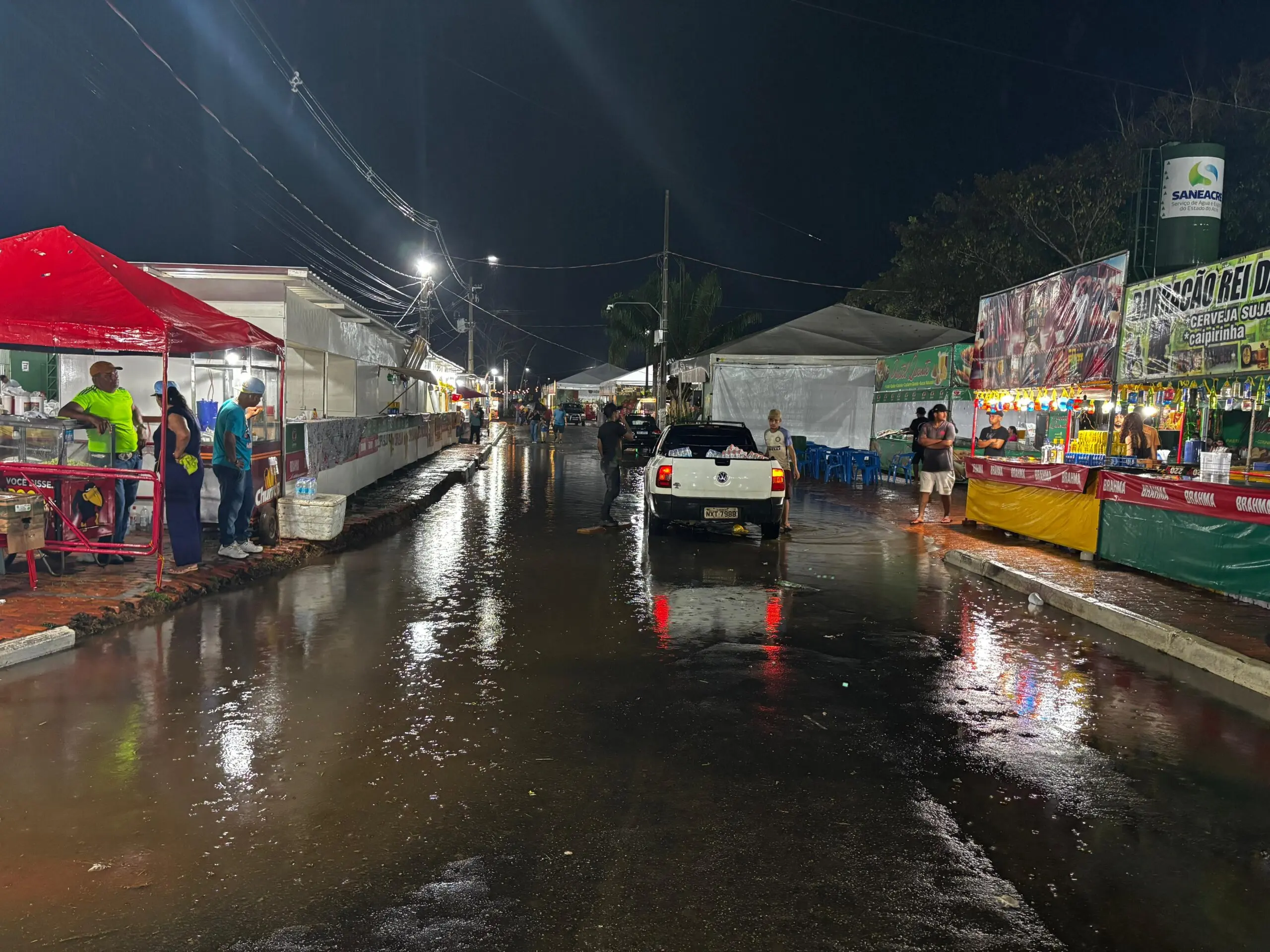 A chuva intensa que caiu durante o início da terceira noite de Expoacre 2025 nesta segunda-feira (28) provocou alagamentos em diversos pontos do Parque de Exposições Wildy Viana.