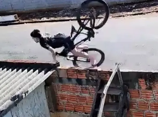 Um vídeo que circula na internet neste sábado (12), mostra um menino que andava de bicicleta sendo arremessado em cima de um telhado após perder os freios do transporte.