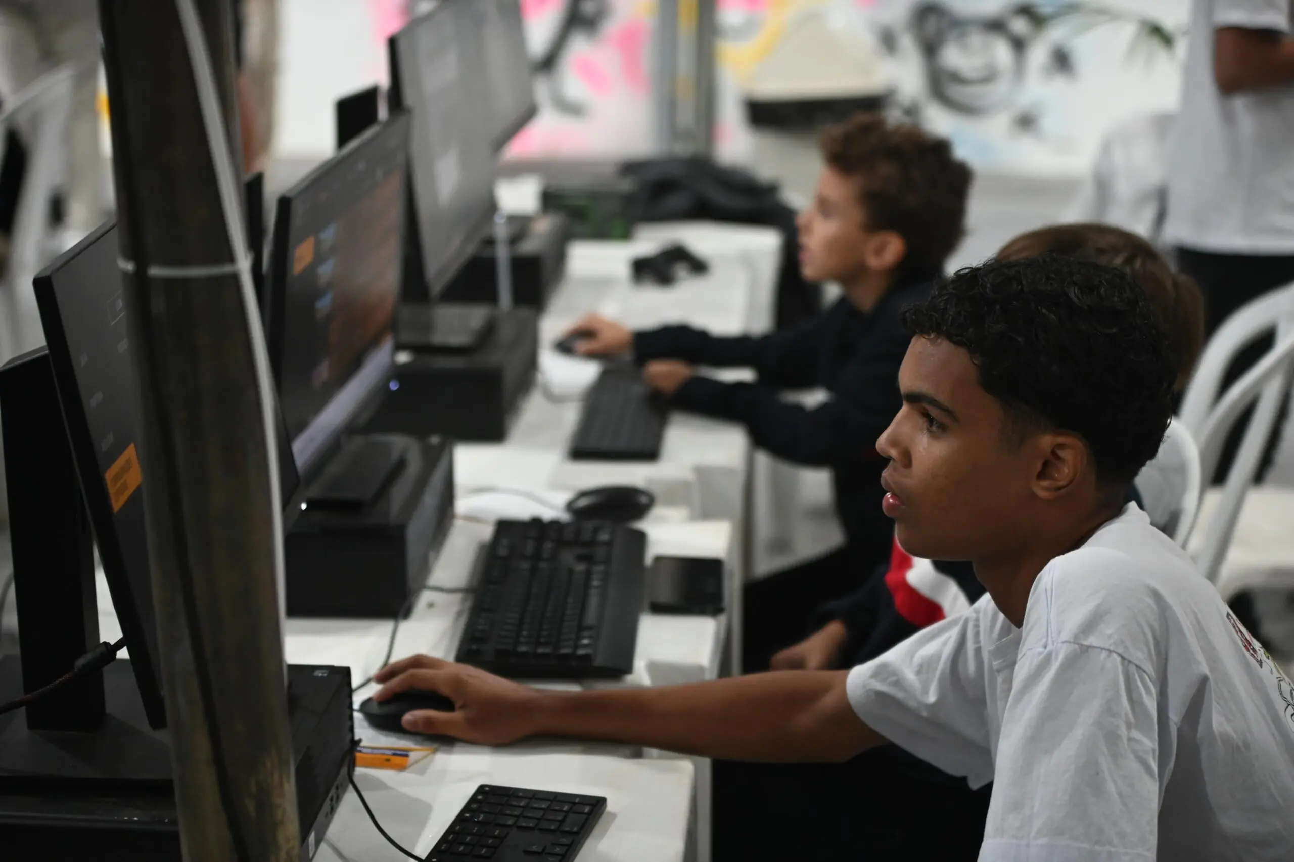 “Hoje eu tô como coordenador da Arena Free Fire, mas o curso que estamos aplicando é de Inteligência Artificial. Ele abrange desde a criação de imagens e textos até a construção de um site e o uso de tráfego pago, caso alguém queira montar uma loja virtual, por exemplo”, explicou Tailon.