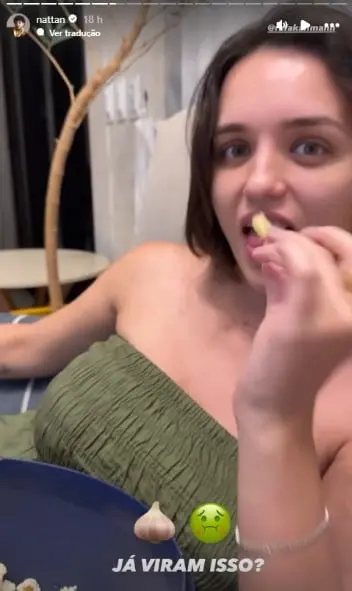“Nunca vi. Quem é a pessoa que come uma bacia de pipoca com alho? Olha como ela come”, disse o pai de primeira viagem, mostrando estar em choque com a atitude da amada. Rafa pegou um dente de alho que estava no meio da pipoca, tirou a casca e o comeu inteiro. “É uma delícia”, garantiu a ex-BBB, com o cantor revelando nas imagens que estava com ânsia de vômito.