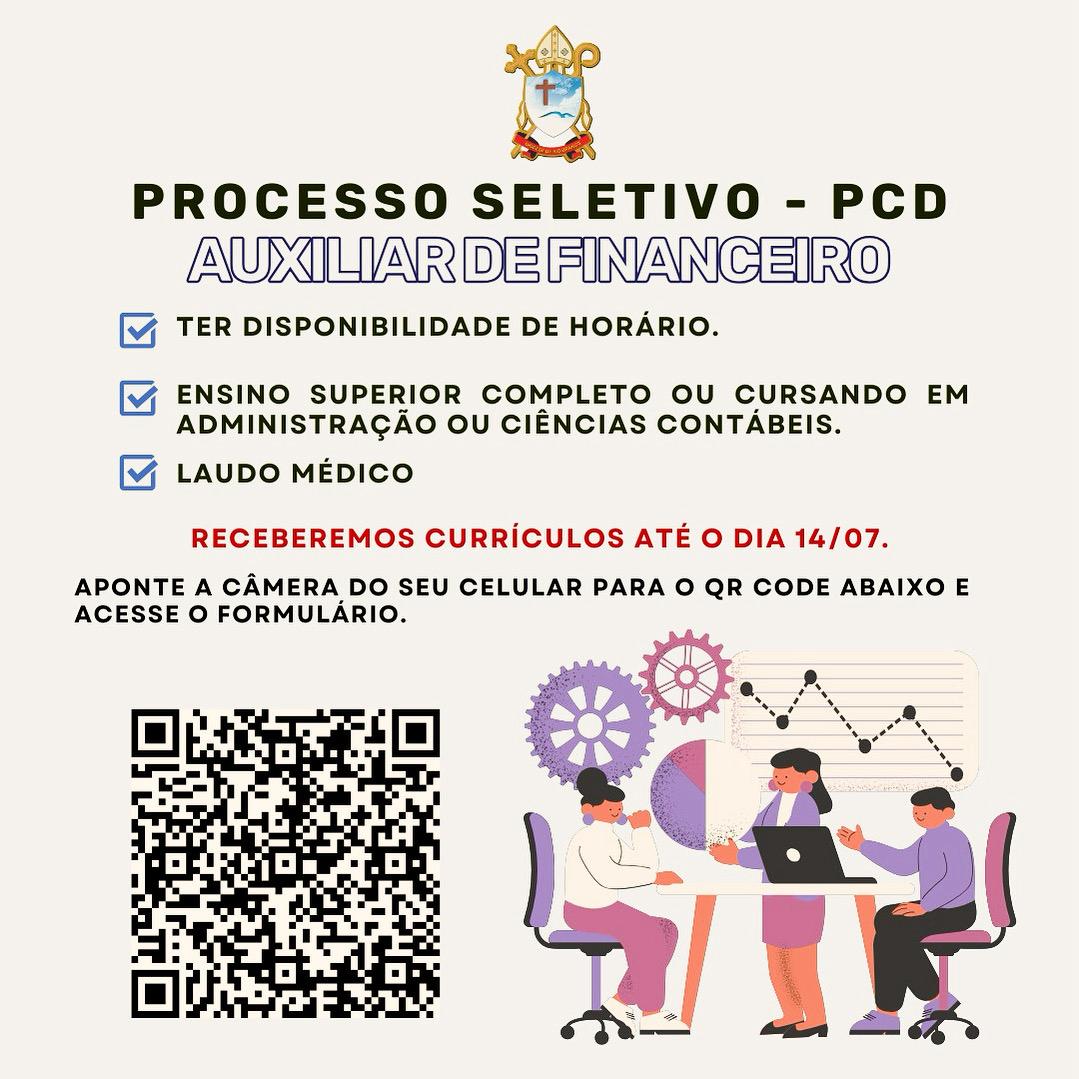 Estão abertas as inscrições para o processo seletivo de Auxiliar de Financeiro, com vaga exclusiva para Pessoa com Deficiência (PCD), para atuação na Diocese de Rio Branco. Os interessados devem se atentar aos requisitos exigidos e ao prazo final para envio do currículo.