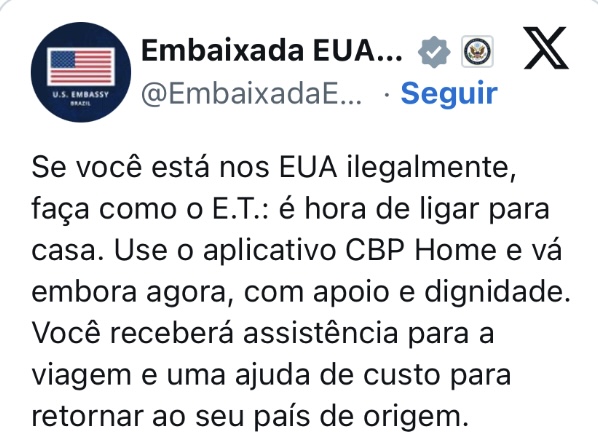 “Se você está nos EUA ilegalmente, faça como o E.T.: é hora de ligar para casa. Use o aplicativo CBP Home e vá embora agora, com apoio e dignidade. Você receberá assistência para a viagem e uma ajuda de custo para retornar ao seu país de origem”, diz a publicação.