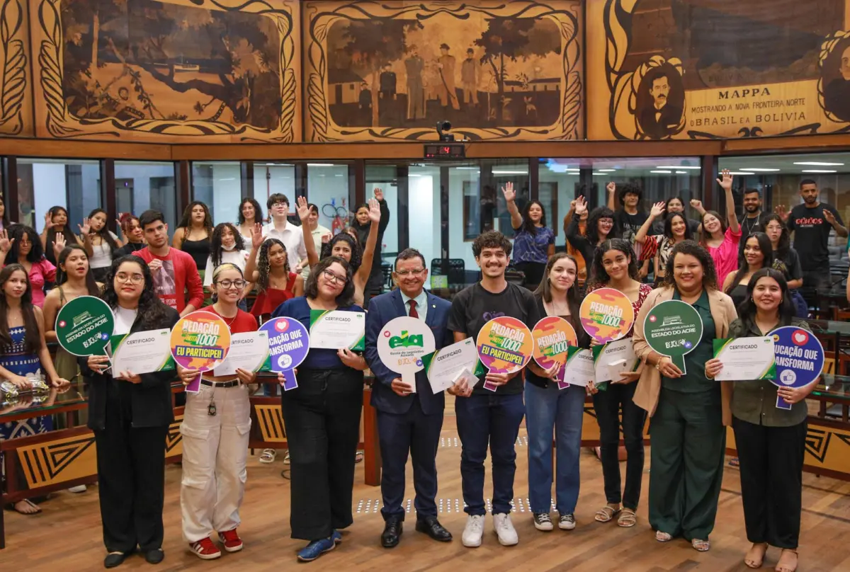 A Assembleia Legislativa do Acre (Aleac) realizou nesta quarta-feira (9), às 19h, o encerramento de mais uma edição do projeto “Redação Nota 1000”. A iniciativa da Escola do Legislativo Acreano atendeu 100 alunos nesta etapa e já alcançou mais de mil estudantes em todo o estado, com destaque para Cruzeiro do Sul, onde foi registrada a primeira nota máxima do programa, onde mais de 400 alunos participaram. Hoje foram entregues os certificados de conclusão do Redação Nota 1000.