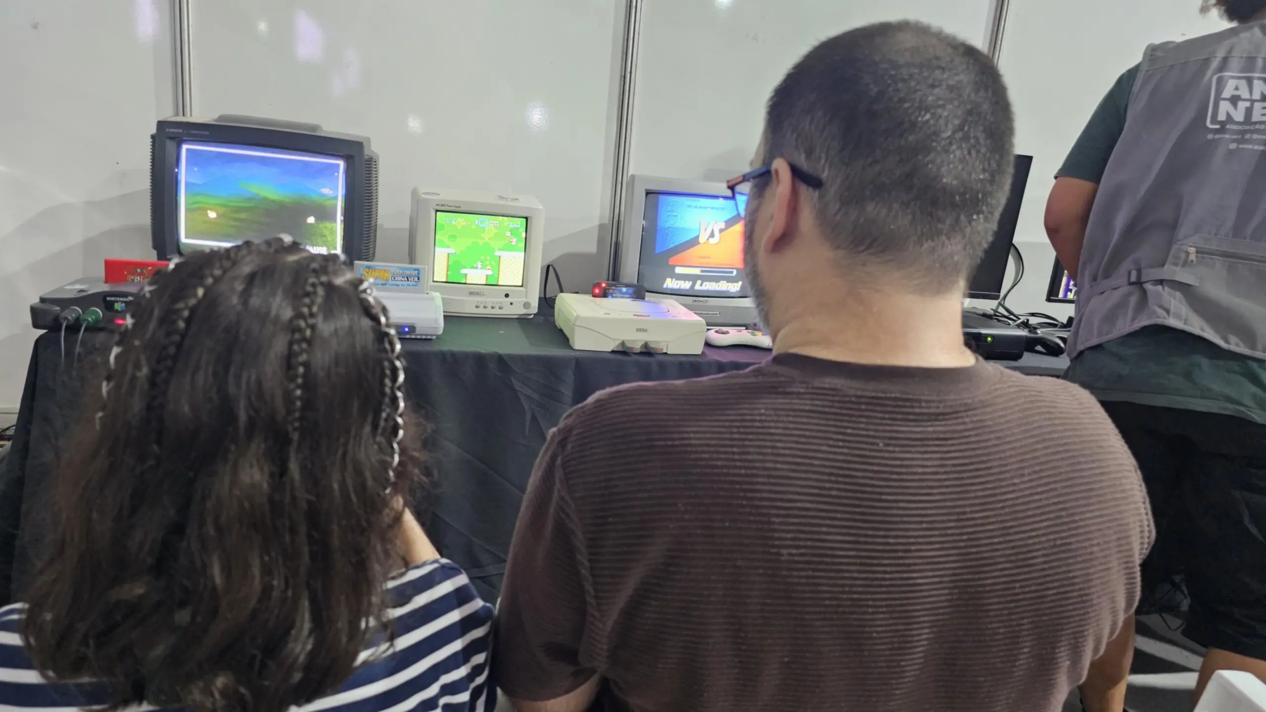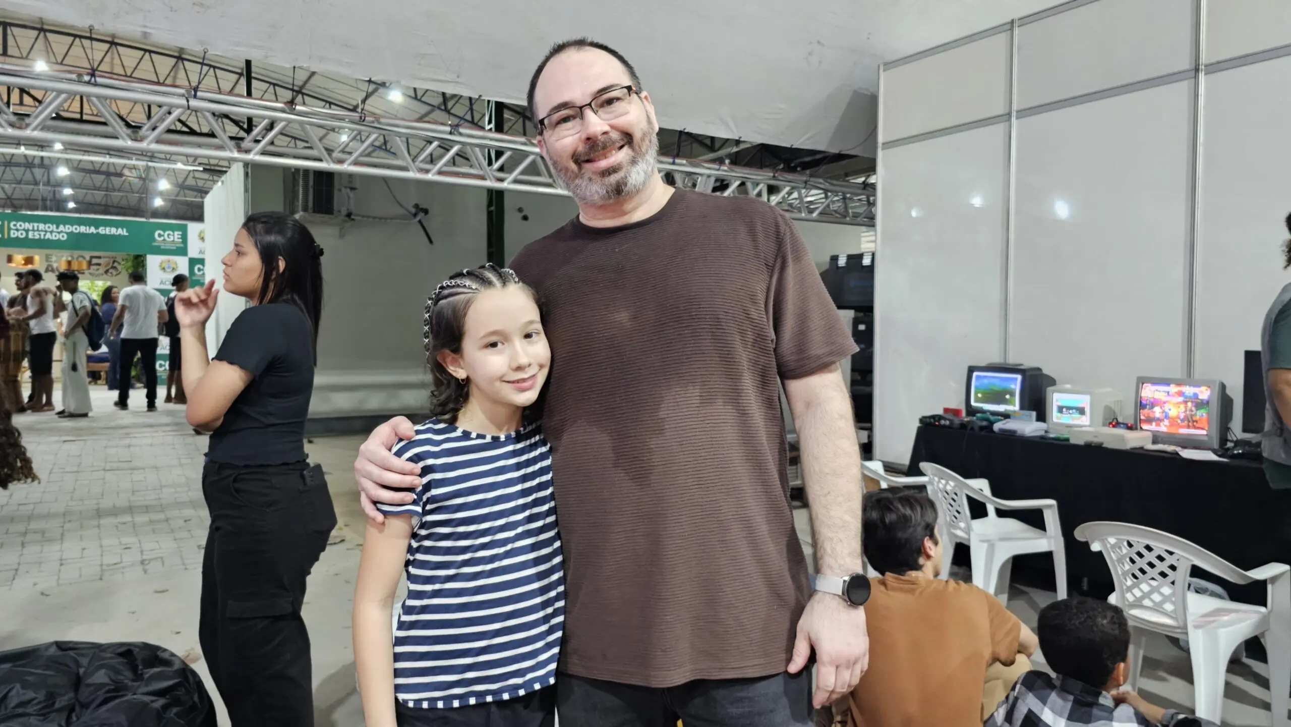 O espaço também tem proporcionado momentos especiais entre pais e filhos. É o caso de João Paulo Aguiar, que levou a filha Larissa para jogar clássicos dos videogames dos anos 90.