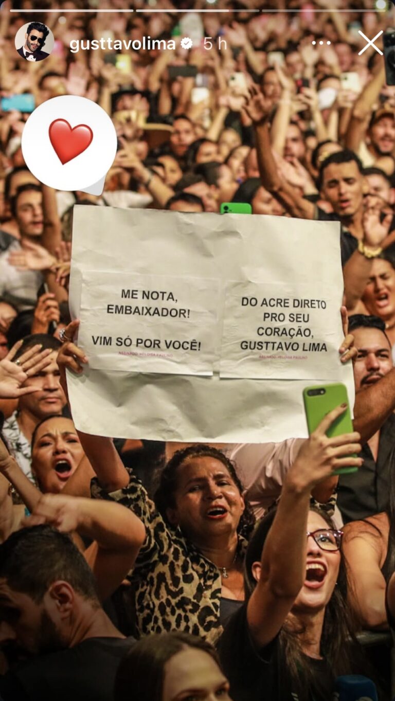 A fã, que fez questão de declarar o esforço para estar presente na noite, escreveu: “Do Acre direto para o seu coração, Gusttavo Lima”. O gesto foi notado pela equipe do famoso, que registrou o momento em meio à multidão e o transformou em uma homenagem virtual.
