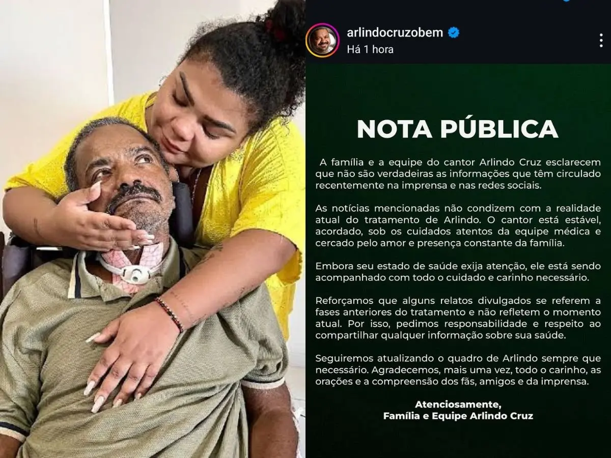A família e a equipe do cantor Arlindo Cruz, internado devido às sequelas de um AVC, publicaram uma nota nesta quarta-feira (16/7) negando informações que teriam sido veiculadas de que o artista não estaria mais respondendo aos tratamentos médicos.