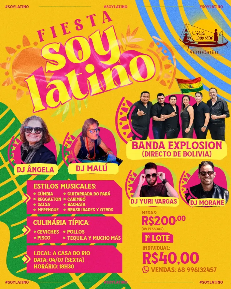 A cidade de Rio Branco se prepara para viver mais uma noite inesquecível de música, dança e celebração cultural com a 4ª edição da Fiesta Soy Latino, que acontece no dia 04 de julho (sexta-feira), a partir das 18h30, na A Casa do Rio.