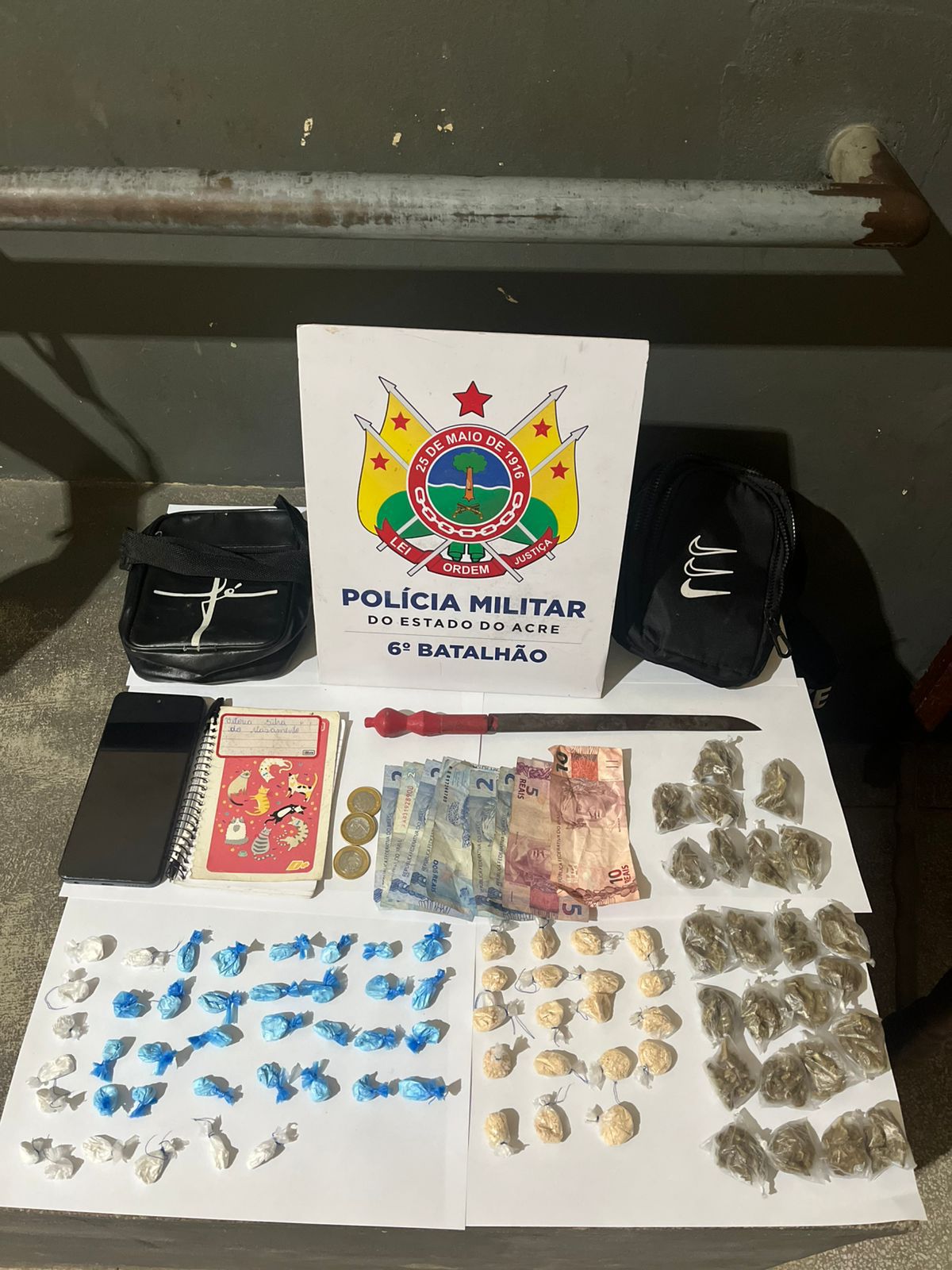 Ao se aproximarem do local, três indivíduos fugiram, mas um deles foi alcançado e detido. Com ele, os policiais encontraram uma mochila contendo diversas porções de drogas, dinheiro em espécie e outros materiais utilizados no comércio ilegal.