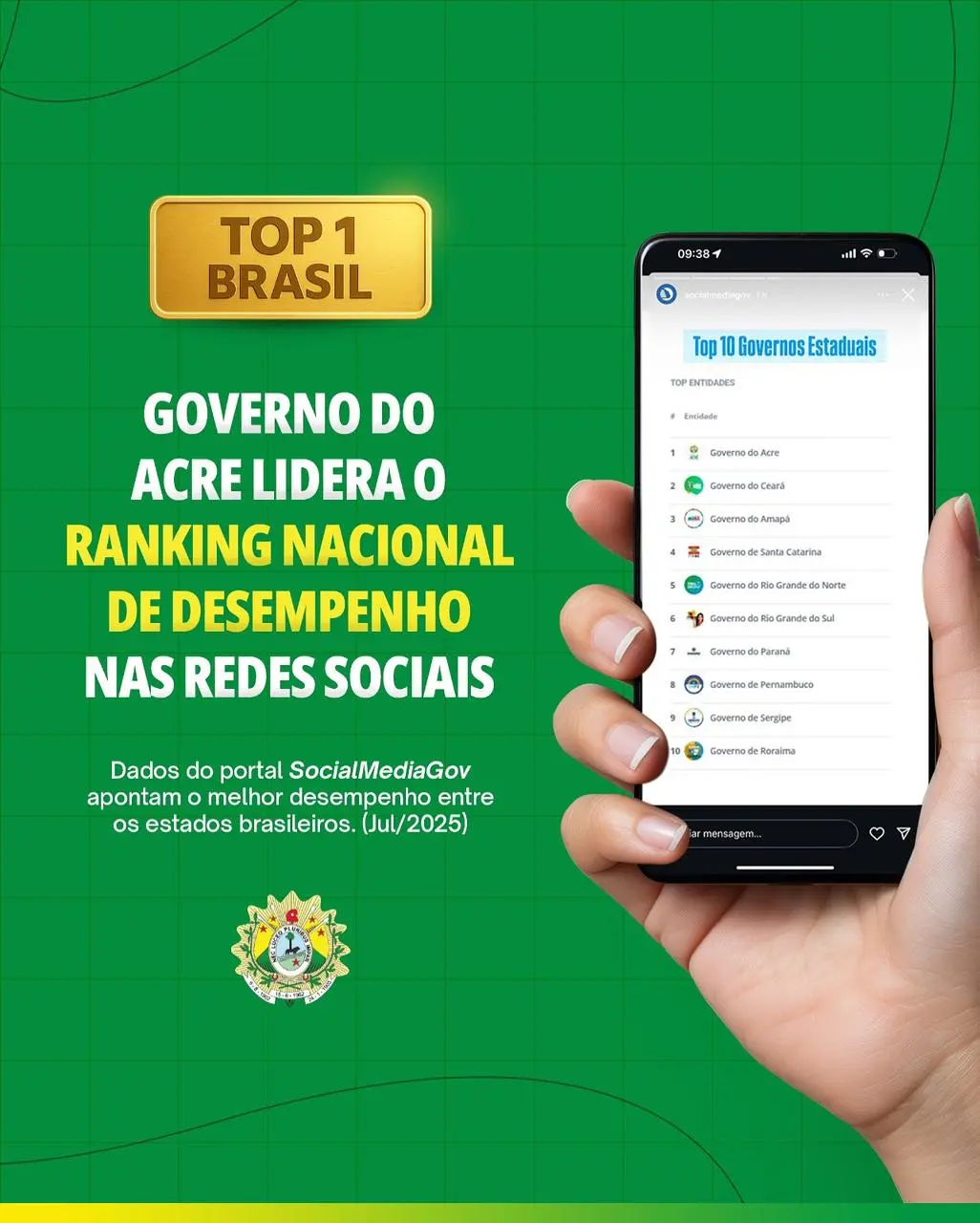 O Governo do Acre alcançou o primeiro lugar no ranking nacional de desempenho nas redes sociais, segundo dados divulgados nesta quinta-feira (31) pelo portal especializado SocialMediaGov. A análise aponta os dez estados brasileiros que mais se destacaram em engajamento, alcance e presença digital no mês de julho.