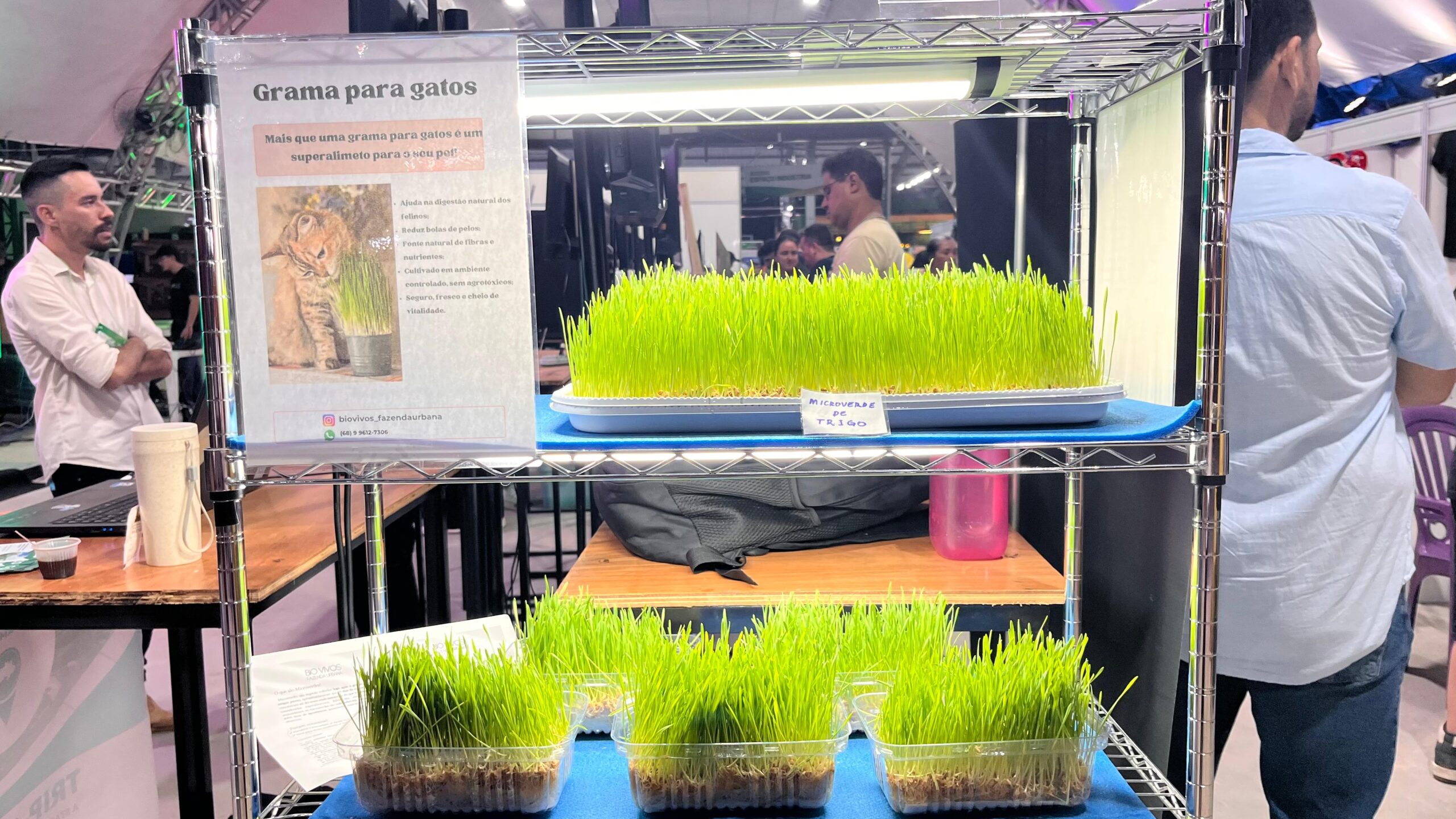 Segundo o farmacêutico e CEO da fazenda urbana, Bio Vivos, Dayan Marques, que está expondo sua produção na feira, a grama de trigo é especialmente benéfica para o trato digestivo dos felinos, além de auxiliar na redução da formação de bolas de pelo, um problema comum entre os animais domésticos.