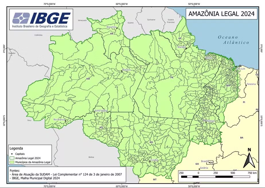 O mapa em questão, elaborado em 2024, tem como finalidade ilustrar a área da Amazônia Legal, uma região criada por lei federal em 1953 com foco no desenvolvimento socioeconômico da região Norte e parte do Centro-Oeste. A Amazônia Legal cobre aproximadamente 59% do território nacional e é composta por nove estados: Acre, Amapá, Amazonas, Maranhão (parcialmente), Mato Grosso, Pará, Rondônia, Roraima e Tocantins.