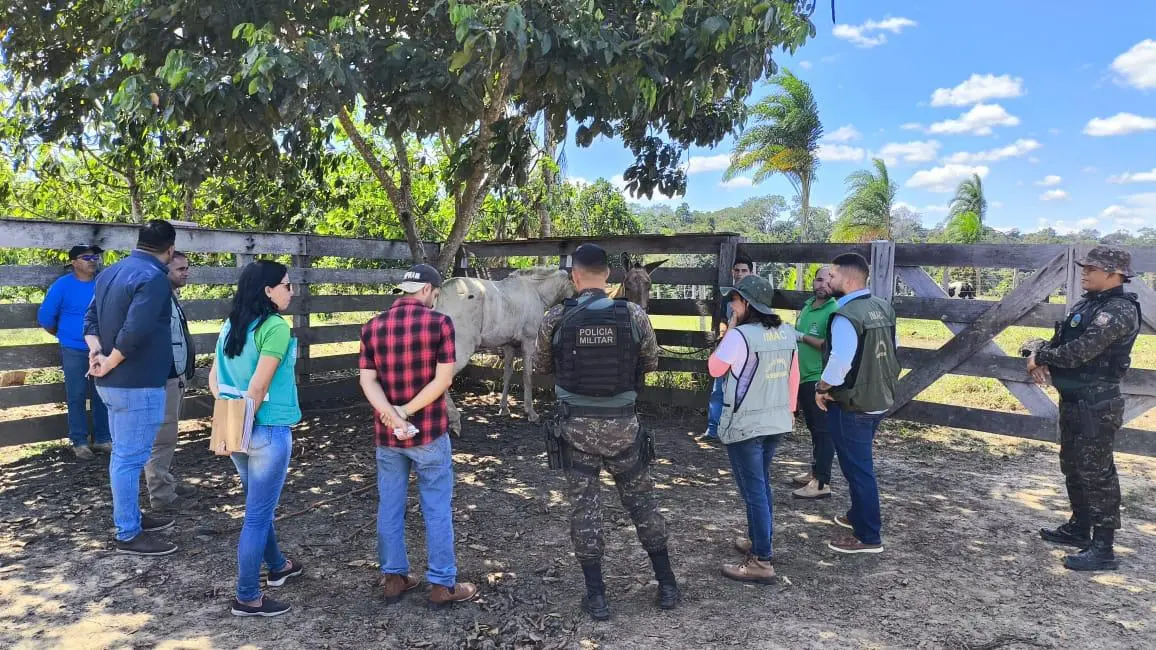 Equipes do 6° BPM, IMAC e IDAF durante ação conjunta em Mâncio Lima após denúncia de maus-tratos a animal na zona rural/Foto: Reprodução