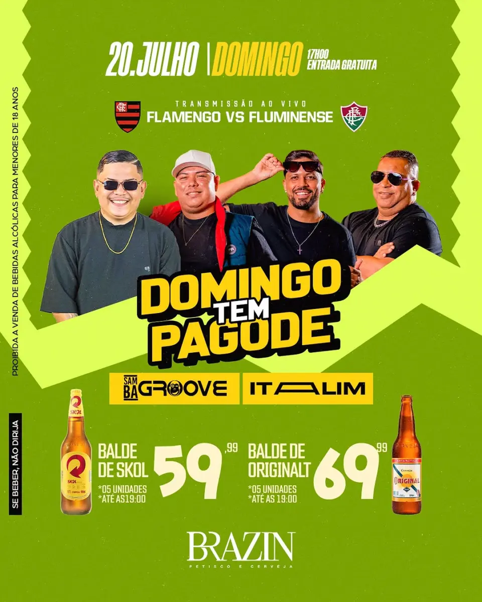 Achou que tá pouco? Essa semana o domingão vem com bastante opção, começando pelo Brazin que vem com aquele pagodinho e a transmissão do Fla Flu pelo campeonato Brasileiro neste final de semana!