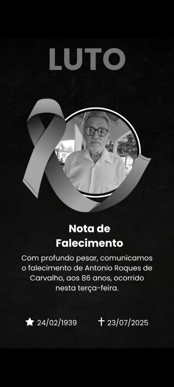 “O vereador Welio Guedes (Podemos), vem por meio desta nota, manifestar profundo sentimento de pesar em razão do falecimento do senhor Antônio Roque de Carvalho, 86 anos, ocorrido hoje em Rio Branco.