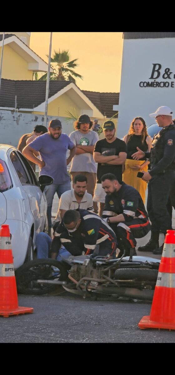Nas imagens é possível ver um carro da marca Fiat, de cor branca, que colidiu com uma motocicleta, que aparece arremessada ao chão, próximo a roda do carro.
