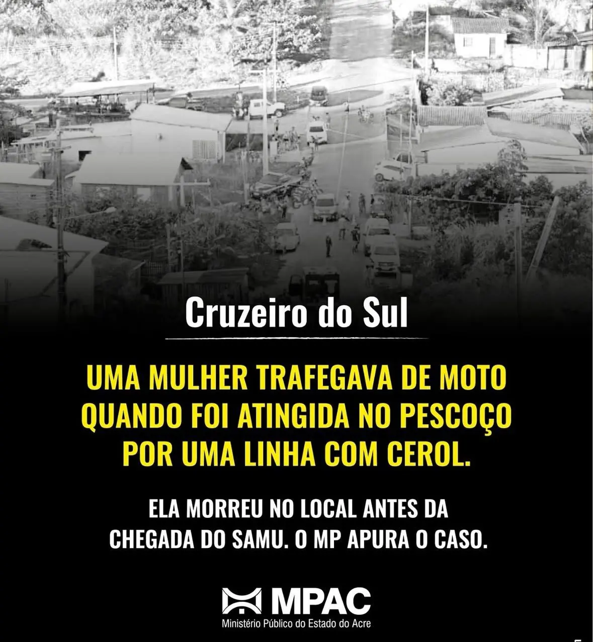 O Ministério Público do Estado do Acre (MPAC) instaurou, nesta semana, uma notícia de fato para apurar as circunstâncias da trágica morte de Jéssica Souza dos Santos, de 33 anos, ocorrida na tarde do último sábado, 19 de julho, no bairro João Alves, em Cruzeiro do Sul. A vítima, que trafegava de motocicleta, foi atingida no pescoço por uma linha com cerol e morreu no local antes da chegada do Serviço de Atendimento Móvel de Urgência (Samu).