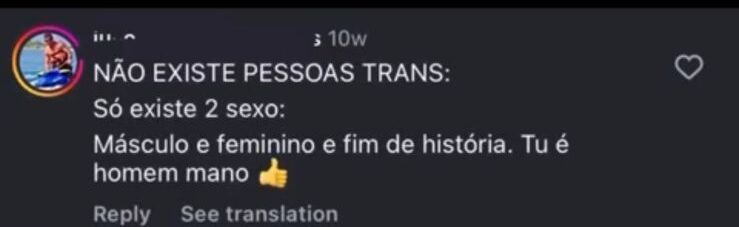 Em uma das interações, o mesmo homem que escreveu publicamente “Não existe pessoa trans, só existe dois sexos: masculino e feminino. Tu é homem, mano” enviou no privado: “Teu futuro marido aqui haha.” Outro que havia comentado “Que coisa ridícula” mandou depois: “Me perdoa a mensagem, pode até ignorar, mas você é um tesão.” Um terceiro que chamou a mulher de “escória” nos comentários, no direct a chamou de “gostosa.”