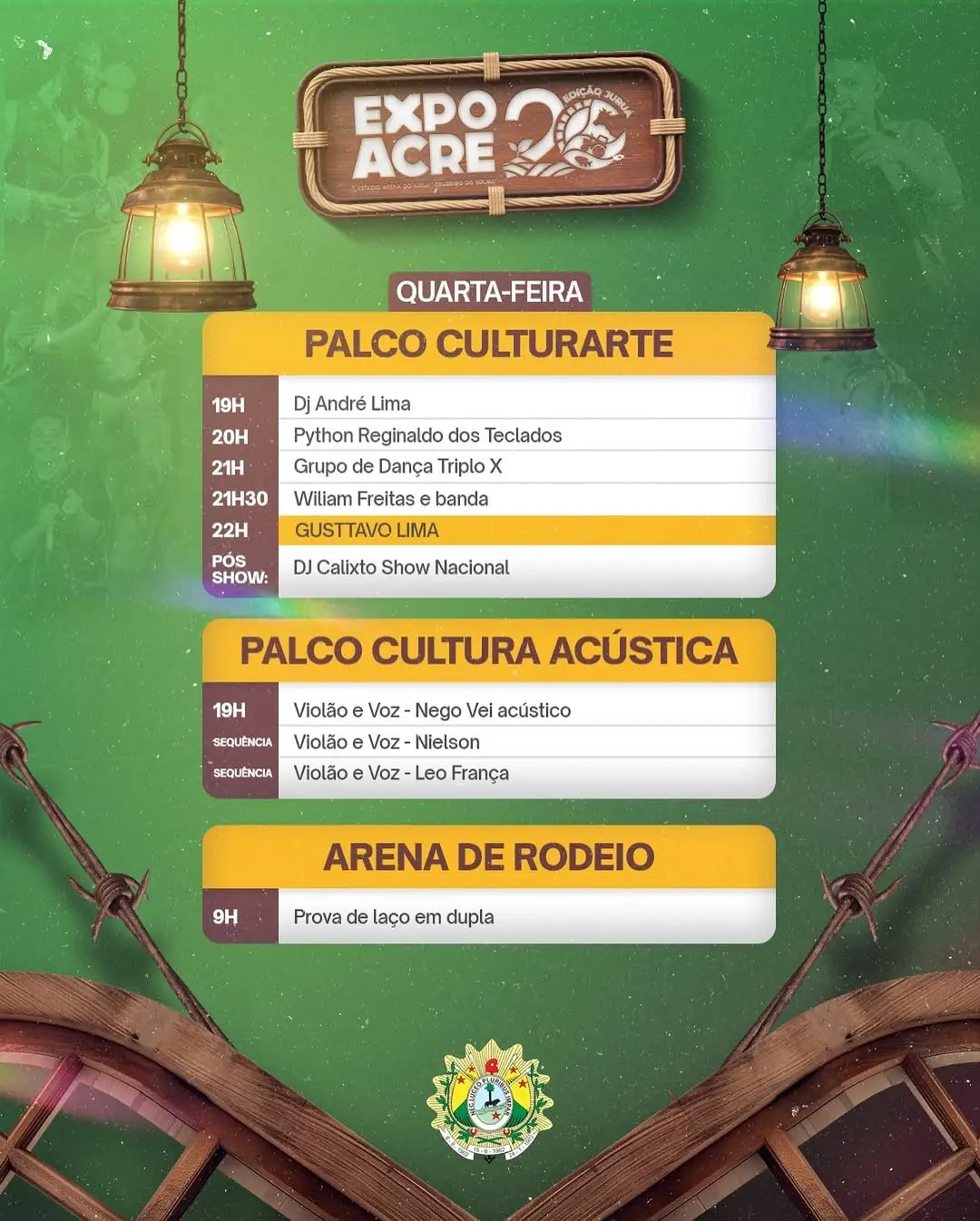 No Palco Culturarte, a programação inicia às 19h com DJ André Lima, seguido por Python Reginaldo dos Teclados às 20h. Às 21h, quem comanda é o Grupo de Dança Triplo X, preparando o clima para a apresentação de William Freitas e banda às 21h30. O show de Gusttavo Lima acontece às 22h e, logo após, DJ Calixto Show Nacional encerra a noite com uma apresentação animada.