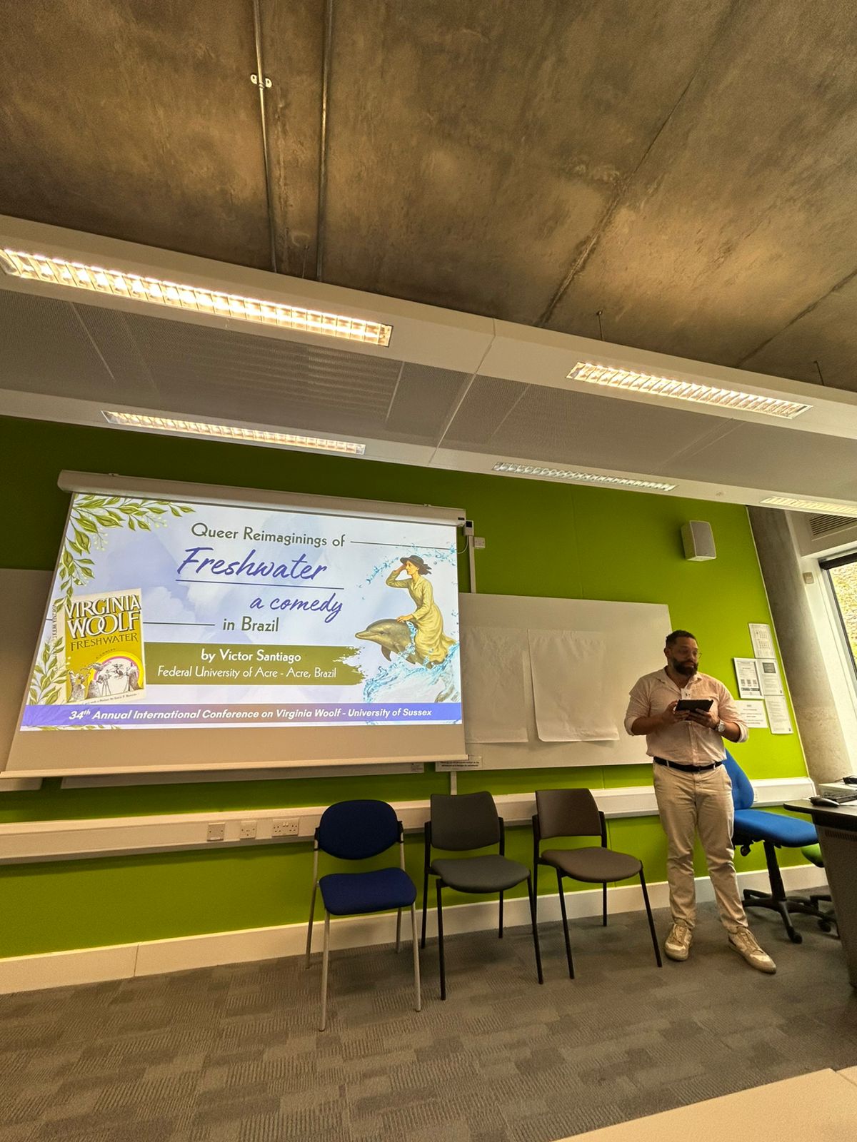O evento que levou Santiago para fora do país foi a 34ª conferencia anual internacional de Virginia Woolf, da Universidade de Sussex (34th Annual International Conference on Virginia Woolf – University of Sussex, no original), onde ele apresentou o trabalho Reimaginação Queer de Freshwater, uma comédia, no Brasil (Queer Reimaginings of Freshwater a comedy in Brazil, no original).
